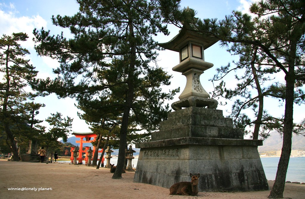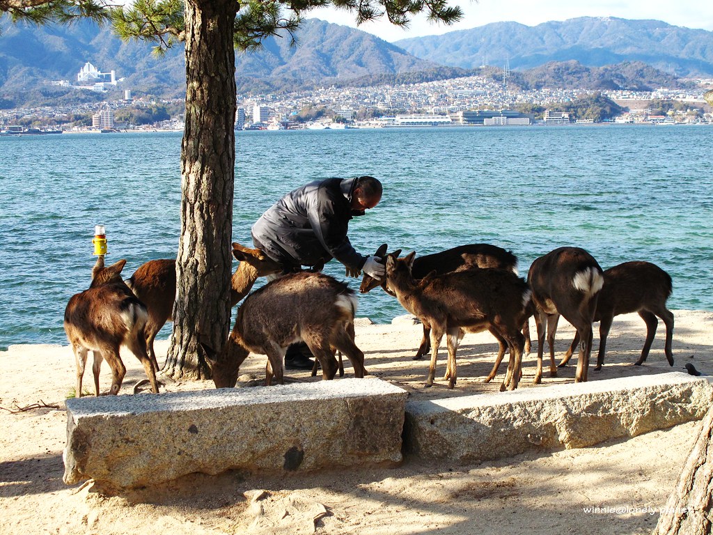在日本,鹿一向被視為神明的使者,宮島和奈良一樣都有四處閒晃的的鹿,不過這裡的數量比奈良少太多太多了,因為二戰後嚴島曾經被美軍接管,士兵哪管鹿神不神聖,抓了就吃,導致鹿隻銳減。直到1952年軍隊撤出,才從奈良運入6頭鹿繼續繁衍,現在看到的鹿就是當年的後代。