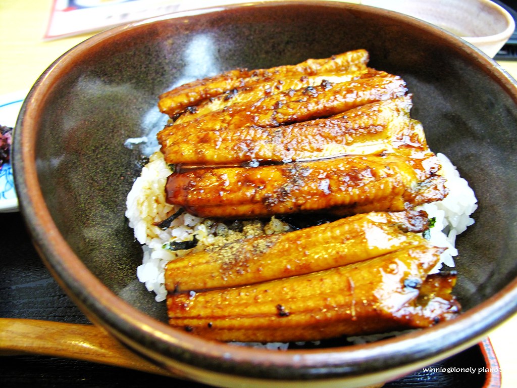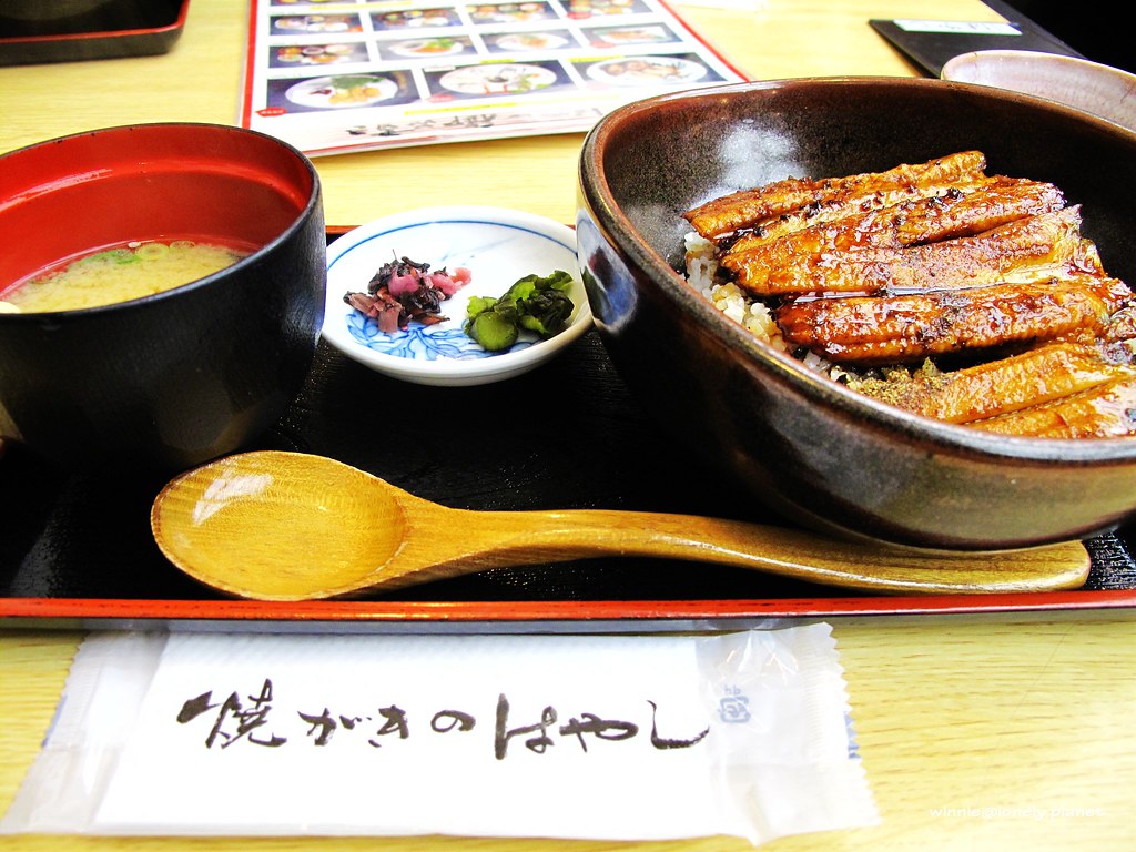 宮島附近的海域除了牡蠣也盛產星鰻,二者並列為宮島必吃美食。宮島商店街上許多餐廳都打出牡蠣和星鰻料理各色料理,我們從彌山下山的時候已經一點半了,飢腸轆轆來到商店街,看到一家餐廳門口正在現烤牡蠣,旁邊櫥窗裡展示的星鰻蓋飯好誘人啊,不管三七二十一就進去了,點完餐等候的時候,翻開手邊旅遊書,才知道誤打誤撞來到有六十年歷史的老店「はやし」,星鰻蓋飯頗受好評,運氣真好!