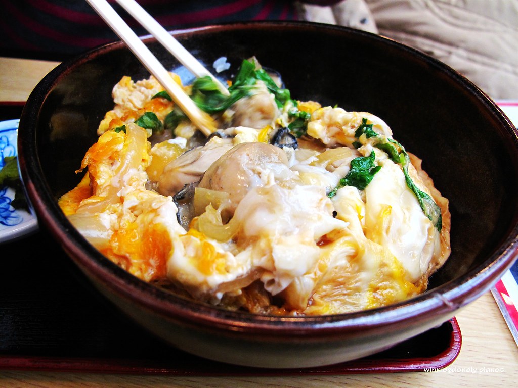 我們點了星鰻蓋飯(あなご飯)、牡蠣丼(かき丼)、牡蠣飯定食(附烏龍麵和天婦羅),星鰻蓋飯的碳烤星鰻已經香氣四溢,淋上特調高湯醬汁更是下飯,不油不膩不鹹相當爽口,肉質細嫩入口即化無比美味,我希哩呼嚕兩三下就吃完了!牡蠣更不用說有多好吃,冬天的宮島牡蠣的確是極品啊!