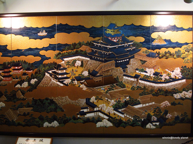資料館就在JR安土站南側廣場,外表雖然相當不起眼,裡面的展示品仍然讓信長迷趨之若鶩。這裡以實物20分之一大小忠實再現豪壯華麗的安土城天守內外部,外觀5重、內部7層、地下1層的分割式模型,屋頂鋪著金箔屋瓦,剖面可詳細觀看內部複雜結構,包括地下1層向上延伸至地上4層的挑高天井樓閣、仿造狩野永徳的襖絵、天花板繪畫,維妙維肖極為精緻。牆上還有幾幅大型陶板壁畫,是仿照安土桃山時代的屏風繪畫風,展現當年安土山、觀音寺山一片欣欣向榮的盛景。