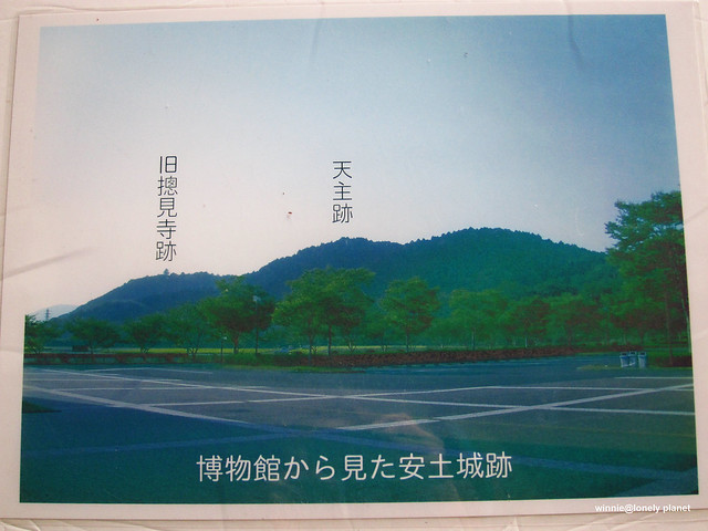 天主信長之館旁就是長得像歐洲教堂的縣立安土城考古博物館,從大門剛好可以看到不久前才爬過的安土山矗立眼前。裏面介紹滋賀縣古代遺址和陳列出土文物,還有安土古城郭歷史變遷和織田信長人物塑像展示。其實還蠻陽春的,而且不能拍照,可以省略不看。