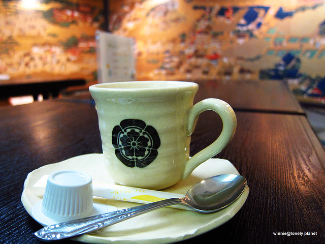 據說傳教士曾經煮咖啡給織田信長喝,資料館腦筋動得快,端出信長咖啡,咖啡杯上印有信長的織田木瓜家紋,走這麼累當然要坐下來喝一杯,為此行劃下心滿意足的句點。