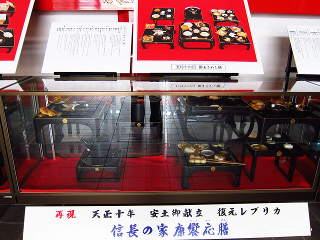 我去的時候剛好展示了1582年5月15日信長在安土城設宴款待德川家康,製作得微秒維肖的御膳模型,可以想見當時信長對家康之倍極禮遇。不知道這段歷史的人不知道這次餐宴重要性,據傳是明智光秀發動本能寺之變的導火線之一。因為信長派光秀負責接待家康的工作,但是信長嫌光秀的魚食材有異味所以K他腦袋,撤換接待工作,命令他率兵去中國地區協助秀吉攻打毛利,這對光秀是奇恥大辱,埋下叛變禍因(當然還有很多因素)。