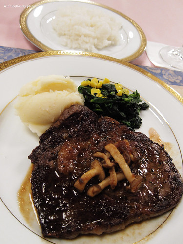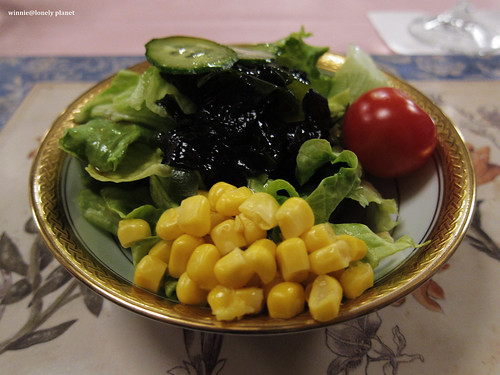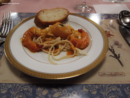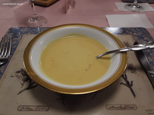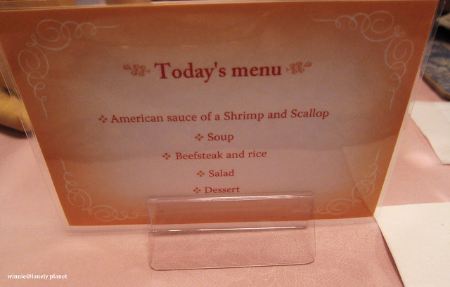 晚餐菜單,底下就是照片,前菜的醬汁、大蝦、濃湯、主菜都相當美味