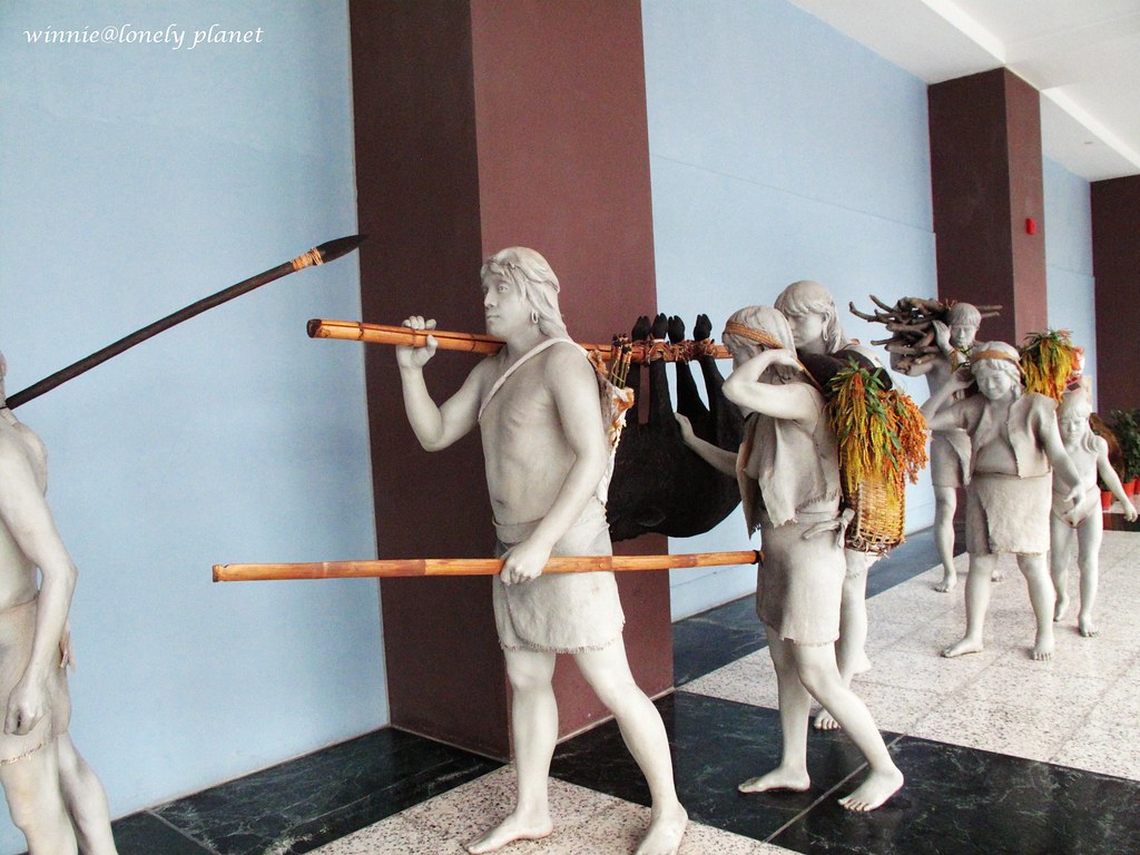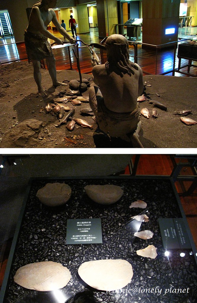 展示廳中心模擬了臺灣新石器時代環境下的生活;陳列櫥窗裡擺設許多殘破後經修復的文物