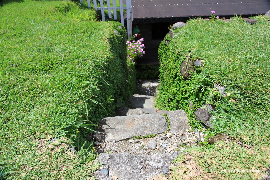 圖左是涼亭,右前方三塊石頭後黑色屋頂就是蓋在地面下的主屋