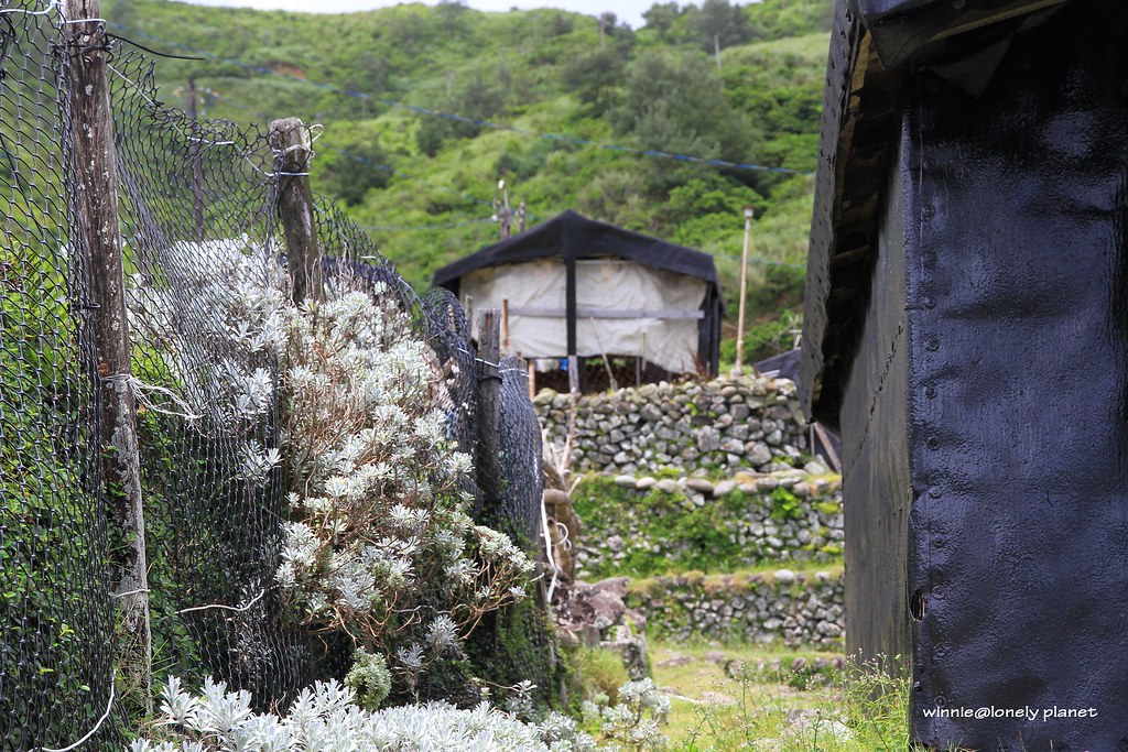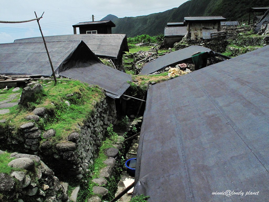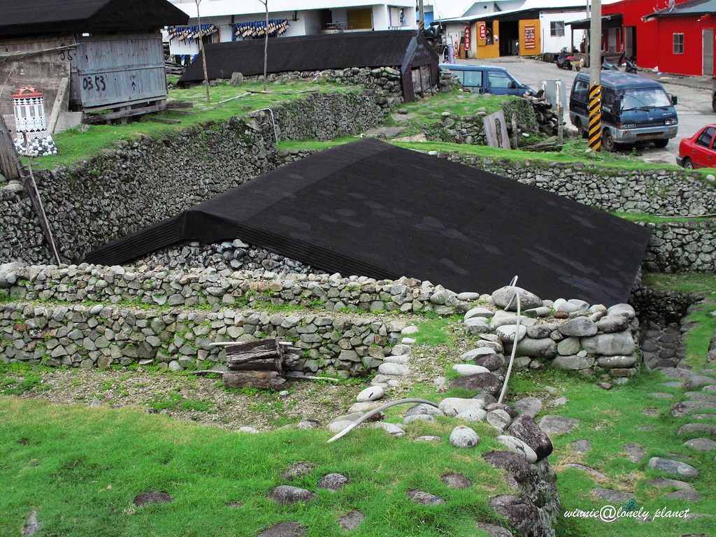 我沿著地下屋前方台階往上爬,來到一片以卵石圈起的「前庭」,這也是傳統屋一部分。前庭裡種植地毯般的草皮「馬尼拉芝」,草地上豎立兩塊或三塊高低不一的石頭,一問之下,原來就是「靠背石」。三塊 「靠背石」自左至右代表父親、母親、長子(女),象徵一家人的靈魂,人死後靠背石會拿掉,我看到屋前靠背石數目不一就是這個原因。