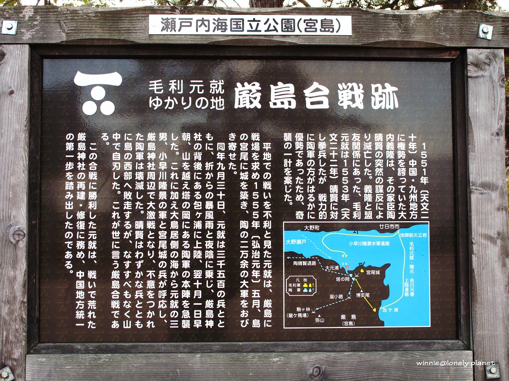 1555年戰國時期毛利元就及陶晴賢曾經在嚴島爆發戰爭,最後毛利軍取得勝利