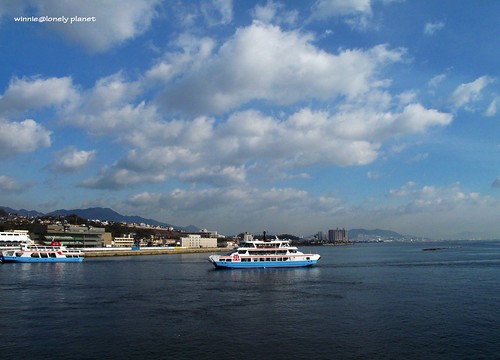 左:敞仰在瀨戶內海上 右:海面上渡輪穿梭不停,每5~10分鐘就有一班