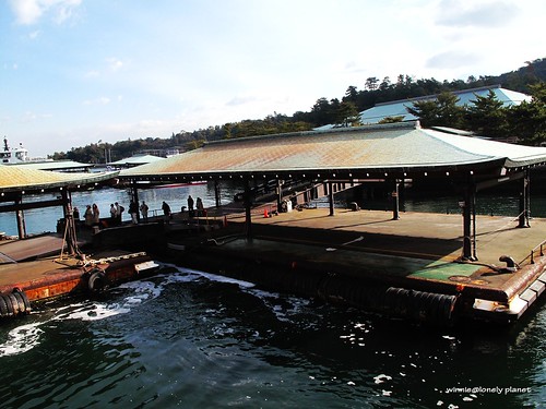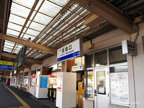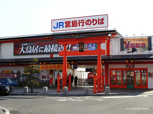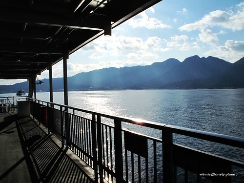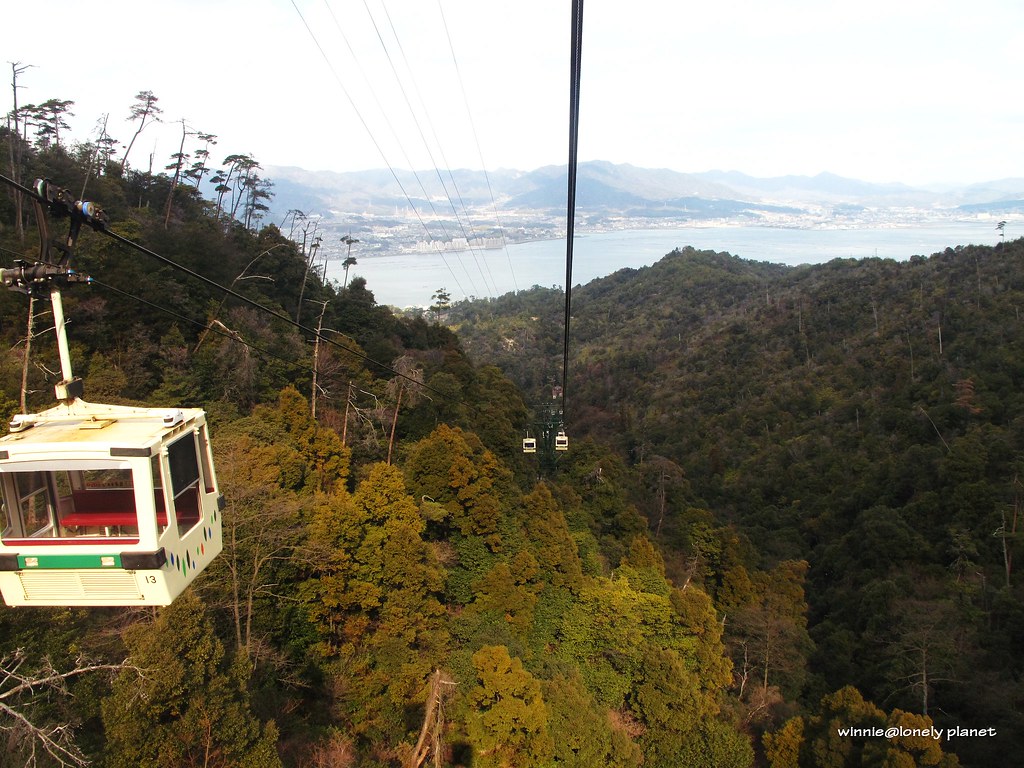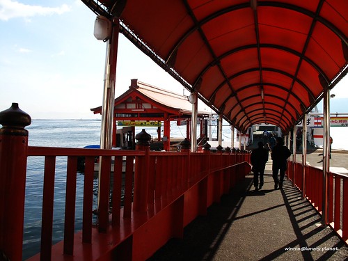 從廣島車站搭JR山陽本線出發,大約半小時抵達宮島口站,接著走到宮島桟橋轉搭渡輪。到宮島有兩種船,分別是JR宮島連絡船與宮島松大汽船,我們有JR Pass,可以免費搭JR宮島連絡船,航程約10分鐘,神之島朝聖之旅就此展開。根據事先查到的潮汐・潮見時間,當天2011年1月27日早上8:54退潮,直到下午14:50才會再度滿潮,我們決定利用早上退潮期間先搭纜車上彌山,下午下山剛好可以遇到滿潮。