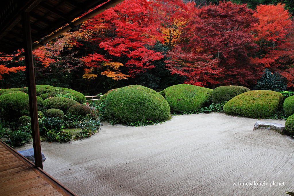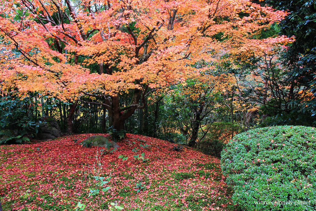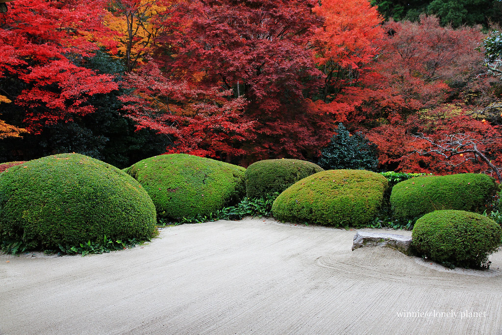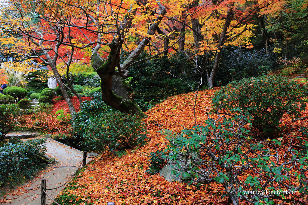 從詩仙之間眺望迴遊式庭園,修剪成半橢圓形的杜鵑花叢,像一座座小山丘自白沙庭浮現,象徵大海與山巒。園中遍植四時花卉,隨著季節遞嬗爭奇鬥艷,最有名是5月下旬杜鵑和11月下旬楓紅。我來的時候運氣不錯,紅葉正盛,一轉角、一回首,都是桃花流水在人世的美麗風情,令我驚豔連連捨不得離開。能有這麼美好的景致日日相伴,再多權勢功名利祿都無法比擬!