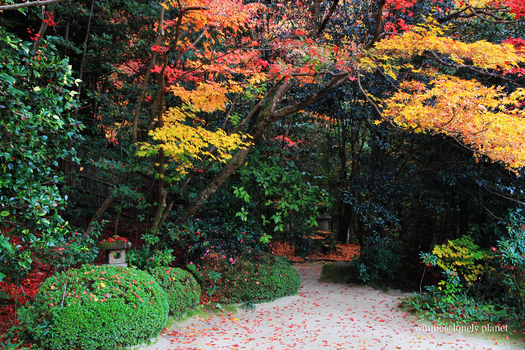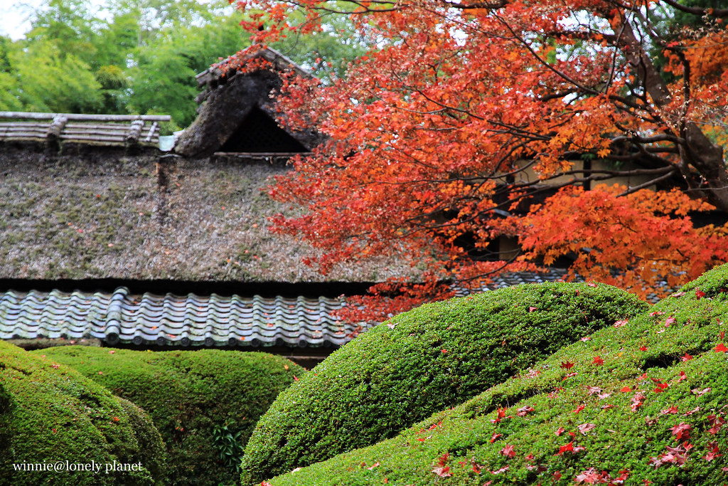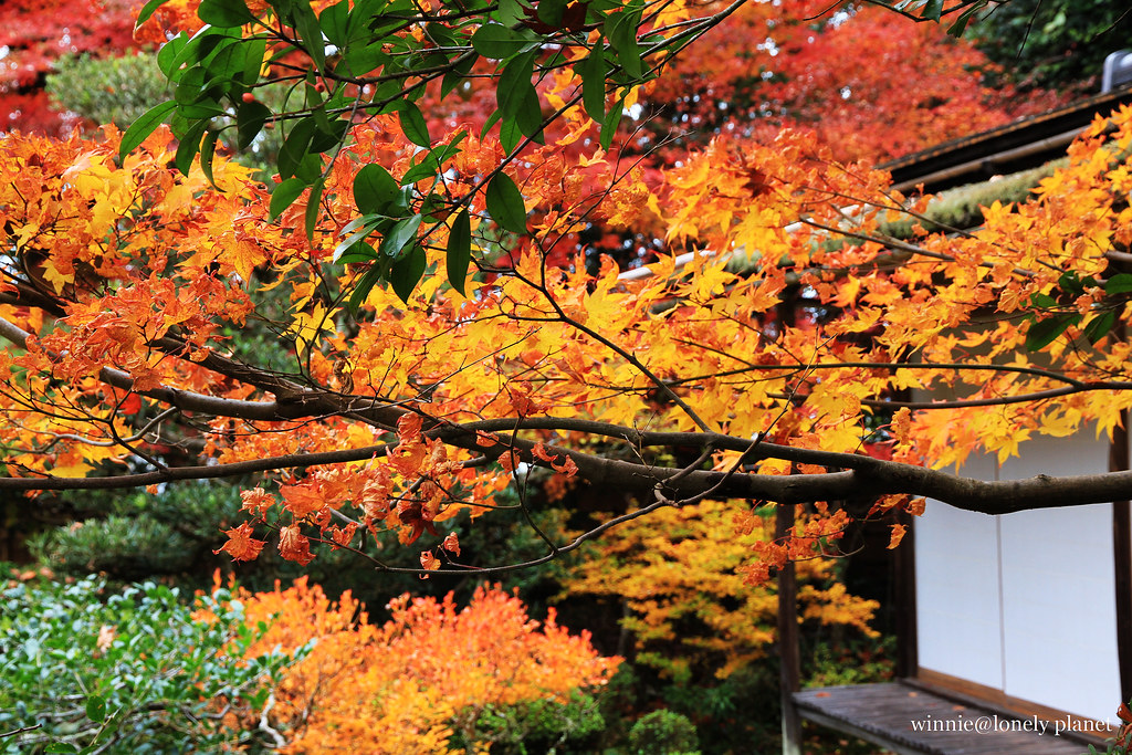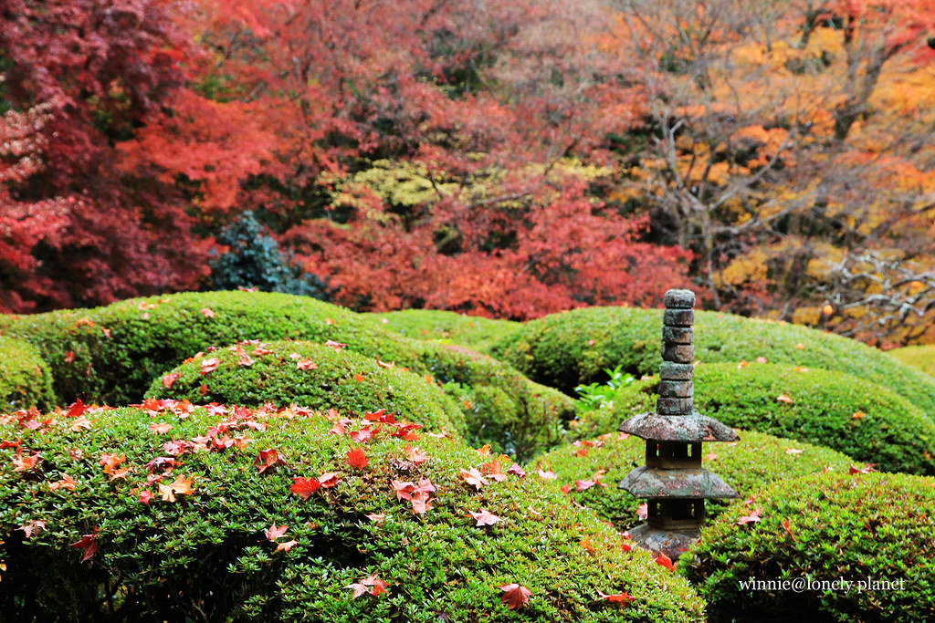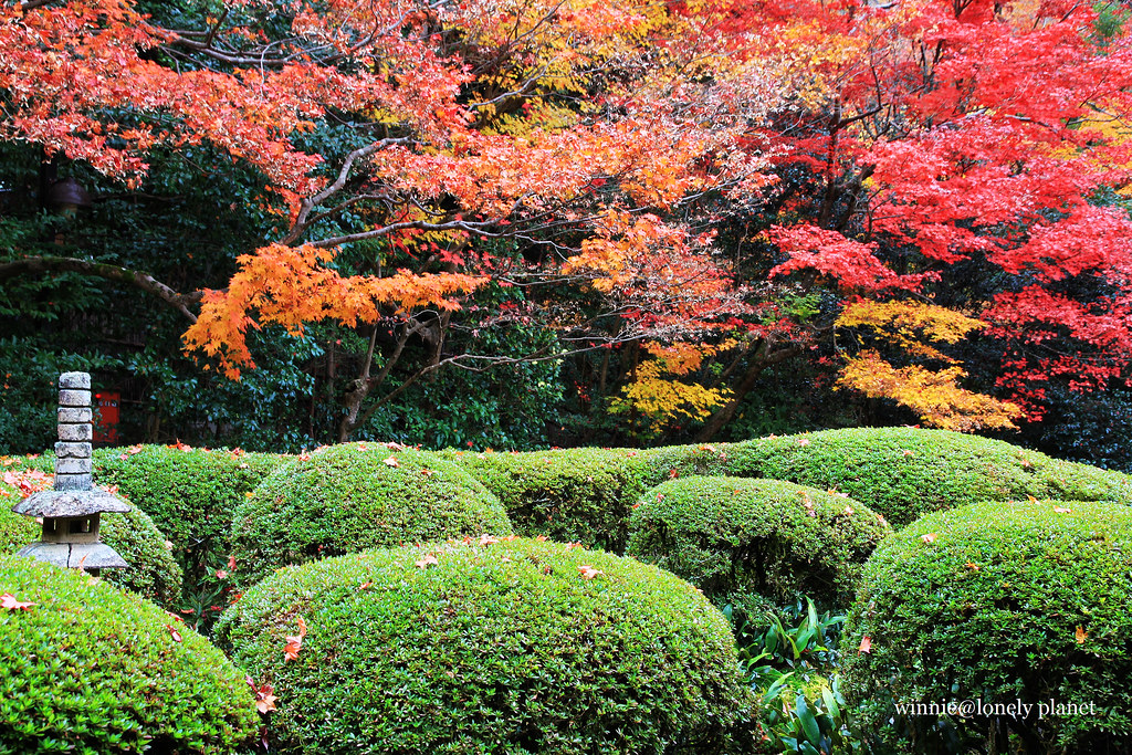 從詩仙之間眺望迴遊式庭園,修剪成半橢圓形的杜鵑花叢,像一座座小山丘自白沙庭浮現,象徵大海與山巒。園中遍植四時花卉,隨著季節遞嬗爭奇鬥艷,最有名是5月下旬杜鵑和11月下旬楓紅。我來的時候運氣不錯,紅葉正盛,一轉角、一回首,都是桃花流水在人世的美麗風情,令我驚豔連連捨不得離開。能有這麼美好的景致日日相伴,再多權勢功名利祿都無法比擬!