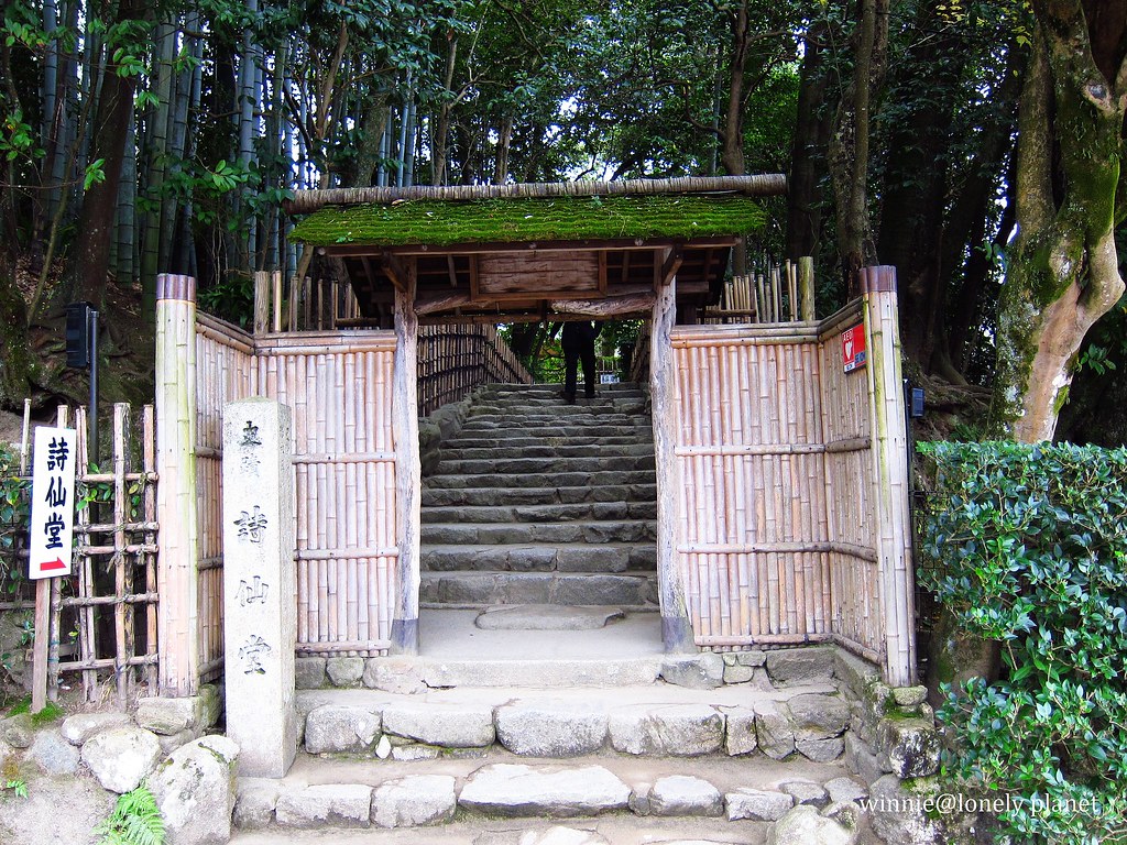 詩仙堂山門非常小,小到很容易擦身錯過,小巧山門的名字「小有洞」倒是相當別致,「小有洞」的含意是「仙境」(唐皇甫冉《祭張公洞》詩之二: 雲開小有洞, 日出大羅天),果然與裡面如詩如畫的庭園相當契合。走進山門拾級而上,石板鋪設的參道小徑兩側竹林蔽天,陽光在林蔭間若隱若現,透露柳暗花明的氛圍。參道盡頭是玄關,穿過玄關就來到主要建築與迴遊式庭園。目前看到的建物只有「嘯月樓」和「詩仙之間」是丈山當時建築,其它是後來改建。