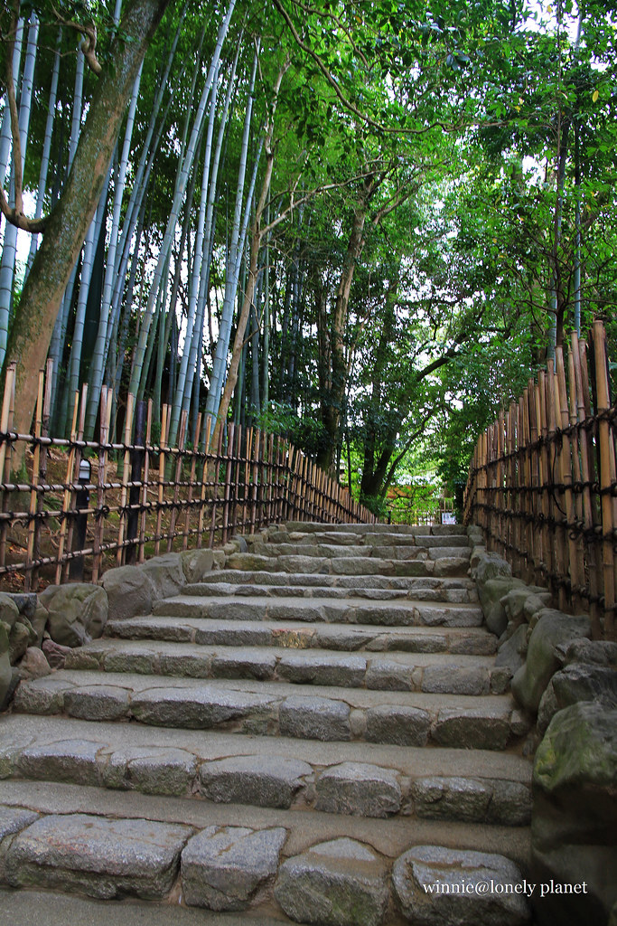 走進山門拾級而上,石板鋪設的參道小徑兩側竹林蔽天