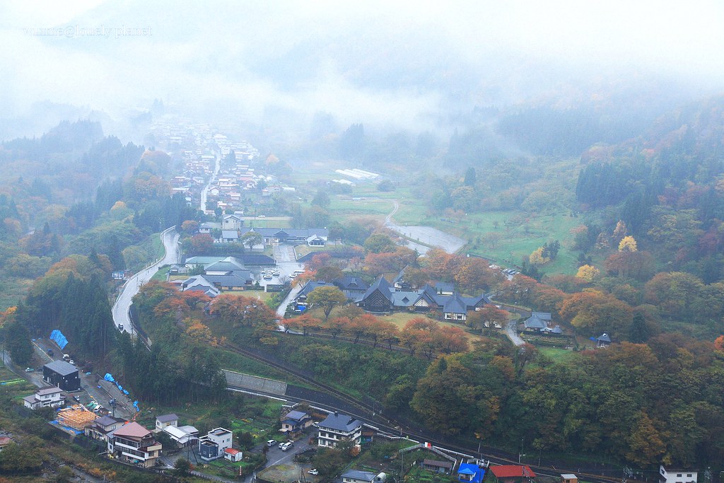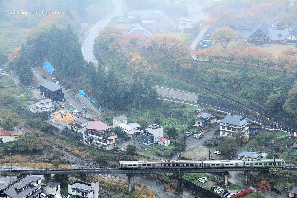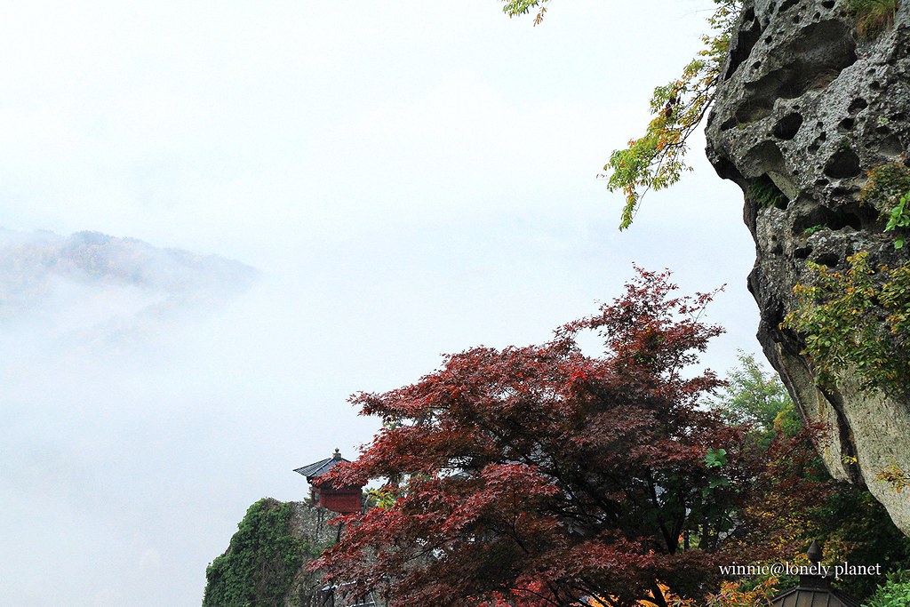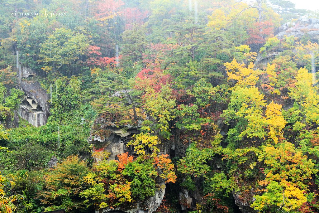 雨勢滂沱,一路上必須使出渾身解數保護相機不被淋溼,還要留意泥濘地面免得跌個狗吃屎,來到五大堂已經渾身狼狽不堪。但是登上五大堂展望台俯瞰四周,即使靄靄烏雲籠罩整座村鎮,嶙峋奇岩與萬紫千紅交織的景色依舊令人讚嘆不已,眼前絕景讓我非常心滿意足,大雨帶來的不便就付之一笑囉!
