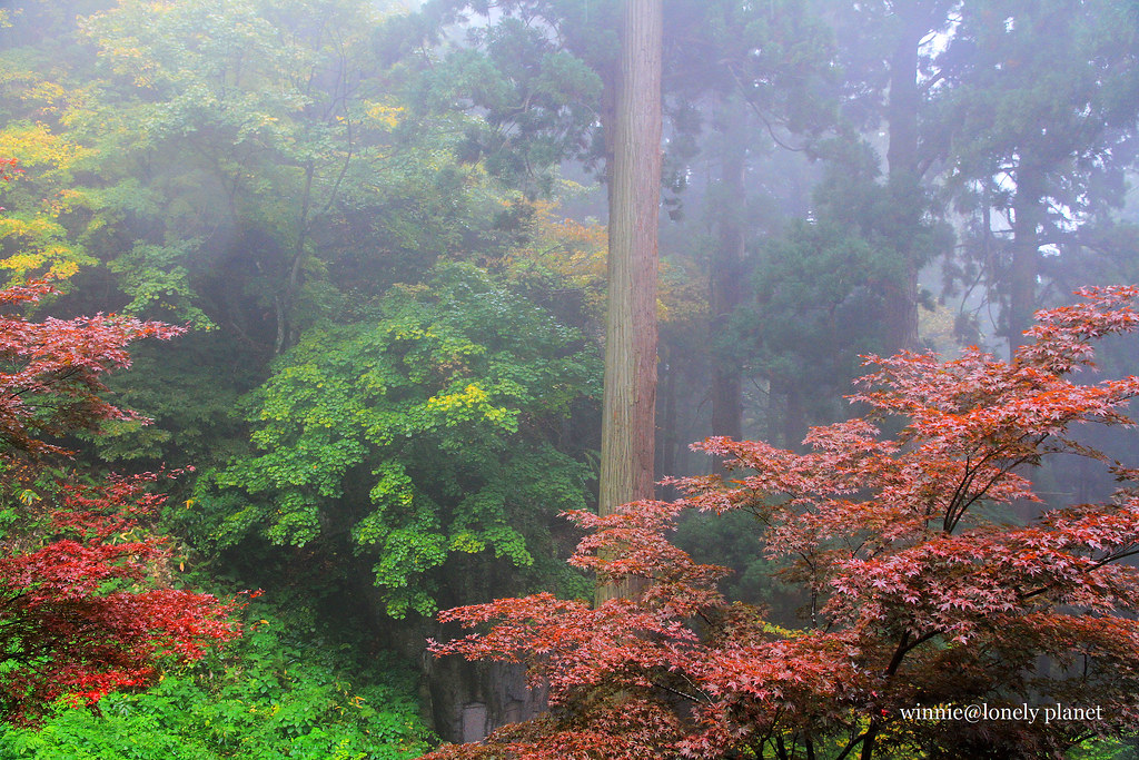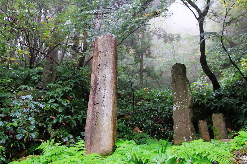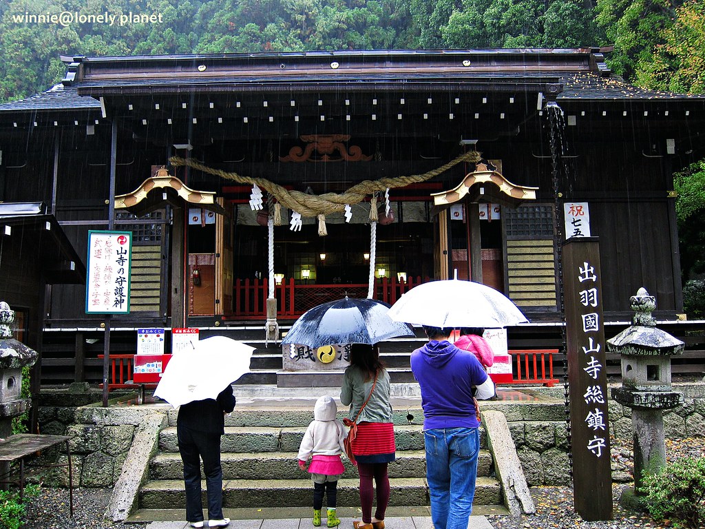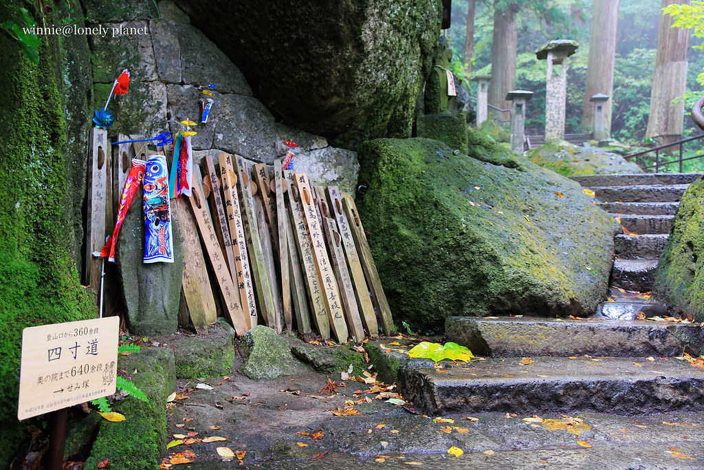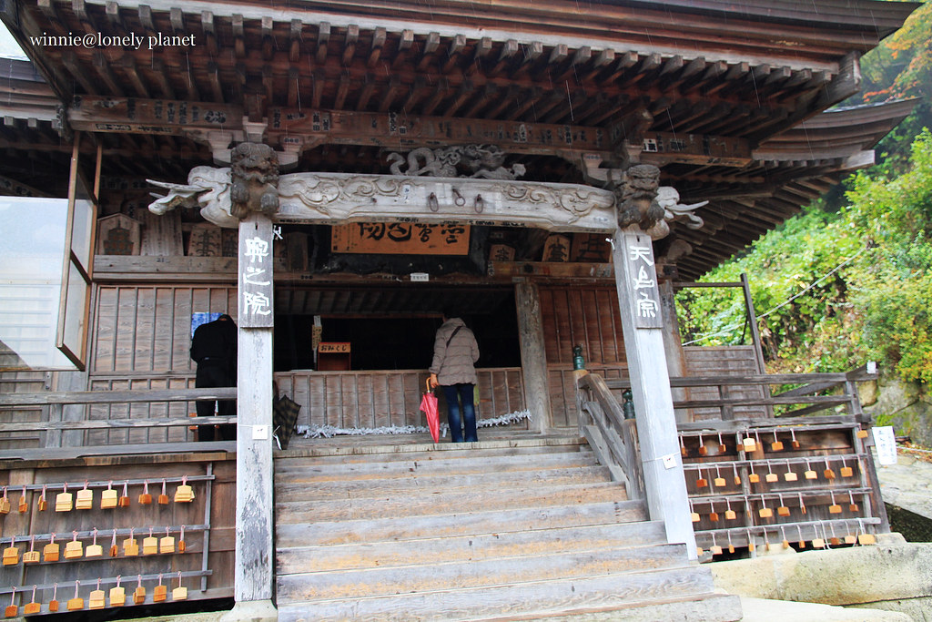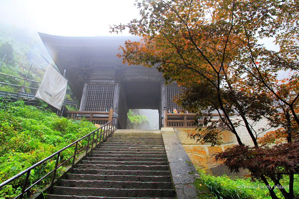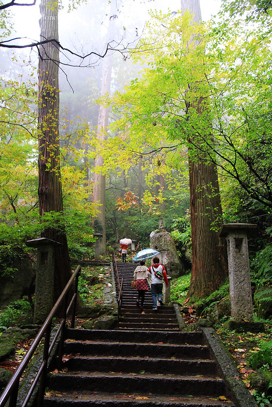 從仙台搭仙山線40分鐘即可抵達山寺,不料天公不作美,竟然下起雨。踏進山門往上攀爬,沿途重巖疊嶂,林木參天,鬱鬱蒼蒼,伽藍處處點綴林間,霏霏霪雨營造出氤氳氛圍。雖然雨越下越大,整片寺域倒是被雨霧潤飾得超俗脫塵,充滿神秘空靈氣息,令人有如置身仙境般。