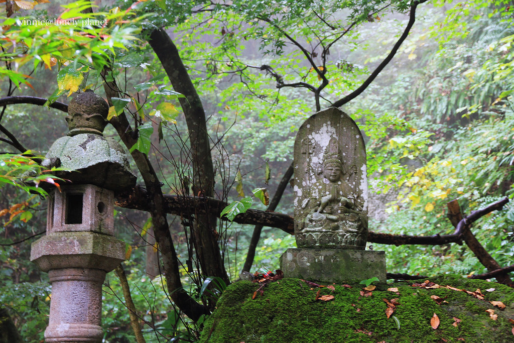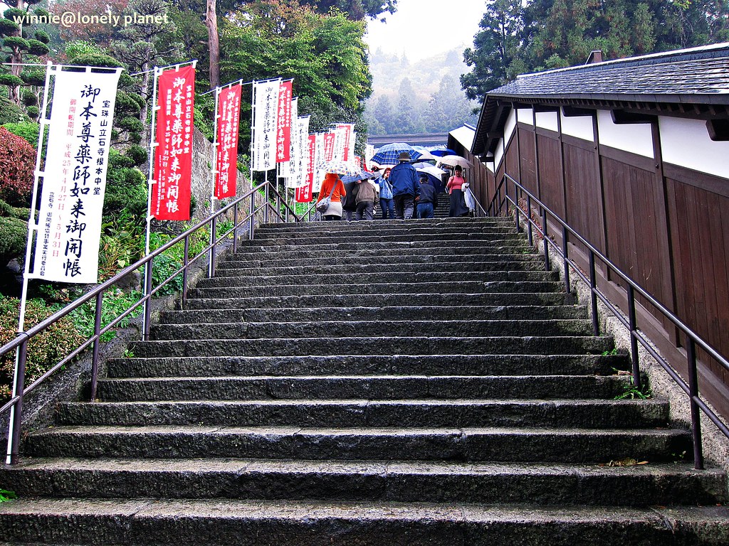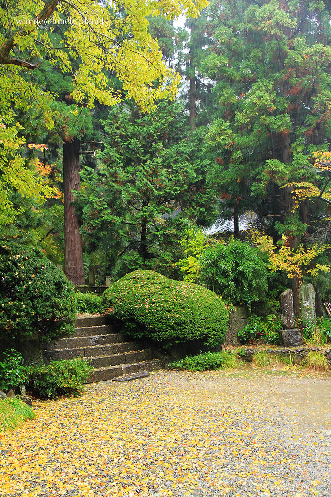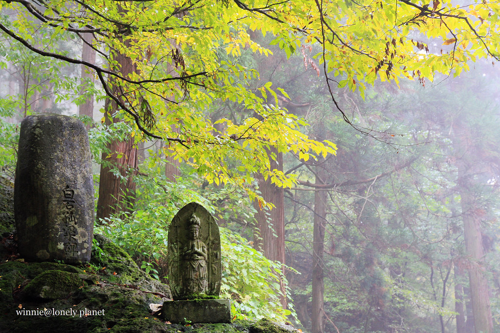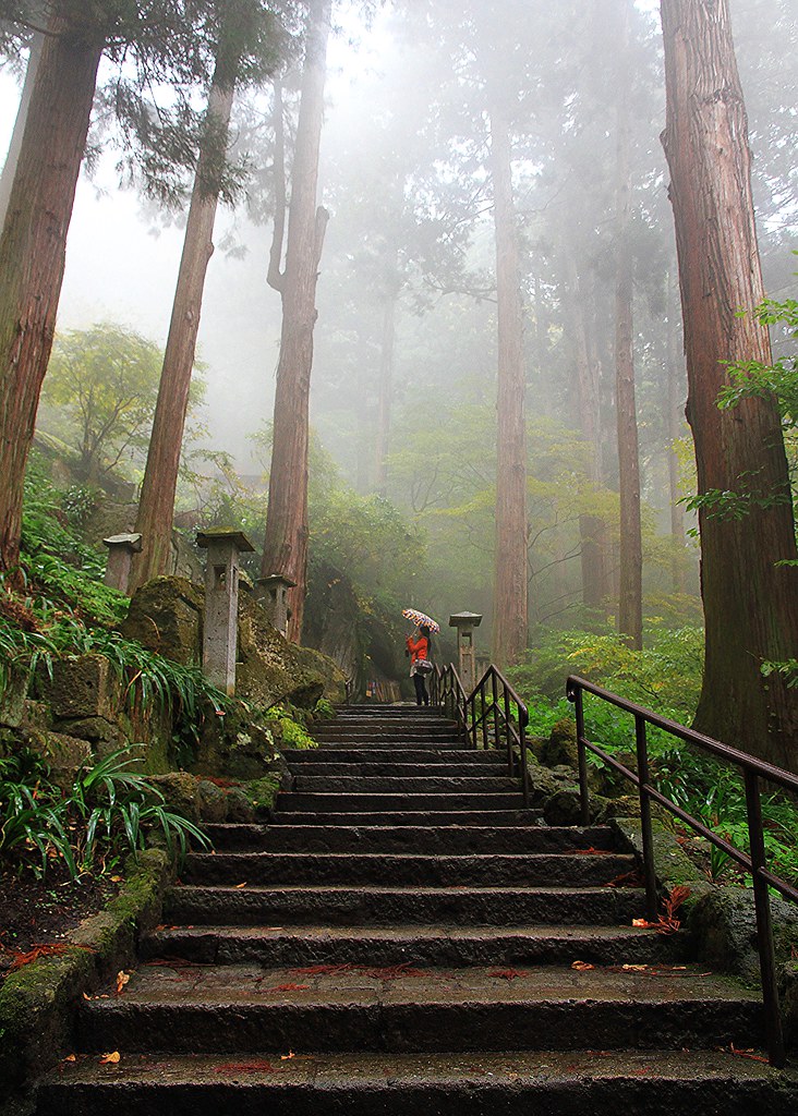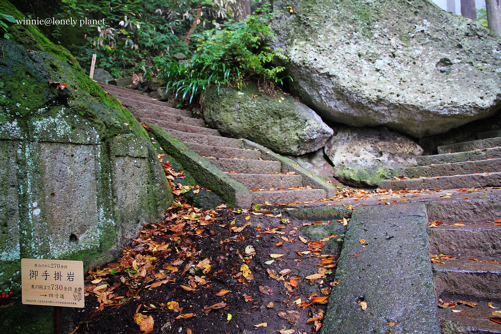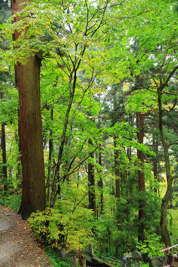 從仙台搭仙山線40分鐘即可抵達山寺,不料天公不作美,竟然下起雨。踏進山門往上攀爬,沿途重巖疊嶂,林木參天,鬱鬱蒼蒼,伽藍處處點綴林間,霏霏霪雨營造出氤氳氛圍。雖然雨越下越大,整片寺域倒是被雨霧潤飾得超俗脫塵,充滿神秘空靈氣息,令人有如置身仙境般。