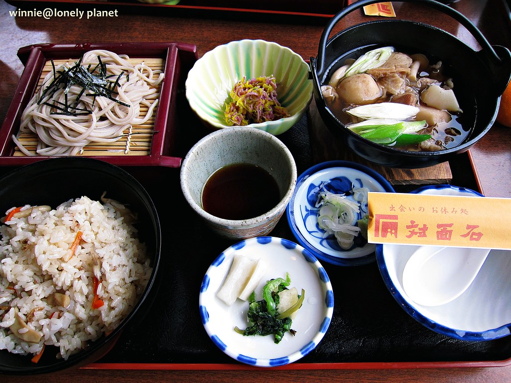 來到立谷川畔對面石旁的「お休み処対面石」茶屋吃芭蕉膳,右上方那小鍋物是山形縣特產:芋煮