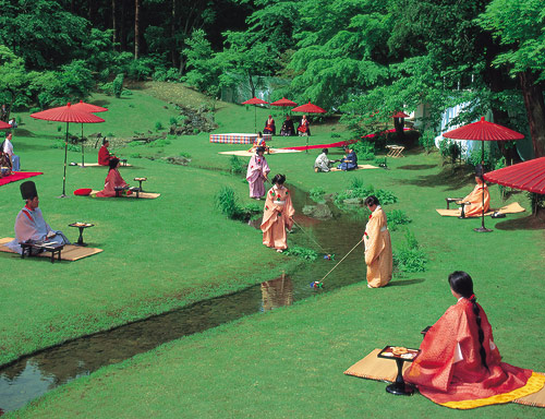 每年五月新綠時節,公卿貴族沿著蜿蜒小河邊兩旁而坐,