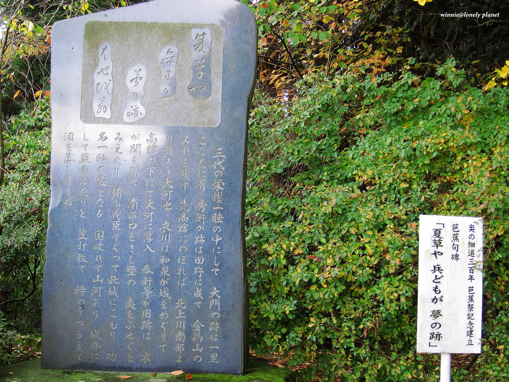 1689年盛夏,松尾芭蕉登上高館遠眺,眼前生機盎然的野草原在艷陽下隨風搖曳閃閃發光,往昔繁華的平泉早已經飛灰煙滅,不禁慨歎國破山河在,城春草自青,而留下名句「夏草や兵共が夢の跡」,意思是,將士們曾經在這裡奮戰不懈,爭功名於一時,終歸化為草叢,只是夢一場。