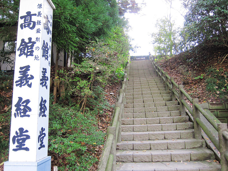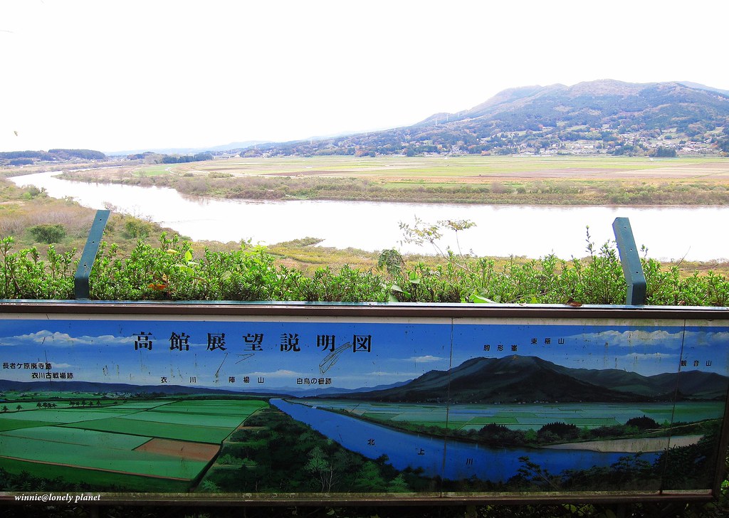 從中尊寺搭乘『るんるん』巡迴巴士沿著崎嶇窄道徐徐爬升,5分鐘左右就會看到「源義經最期の地ー高館義經堂」指示牌。爬上小小受付所旁的階梯,來到山丘上的義經堂,向東眺望,東北最大河(全國第四大)北上川一如往昔緩緩流向天際,觀音山、束稻山、駒形峰等群山環繞,世外桃源般的田園風光,令人無法想像這裡曾經血霧瀰漫,遍地屍骸。但是不知道是不是疏於整理,這裡小黑蟲好多,在我身邊飛來飛去,本來想好好欣賞山光水色,可是實在很害怕被小黑蟲大軍攻擊,只好匆匆下山。