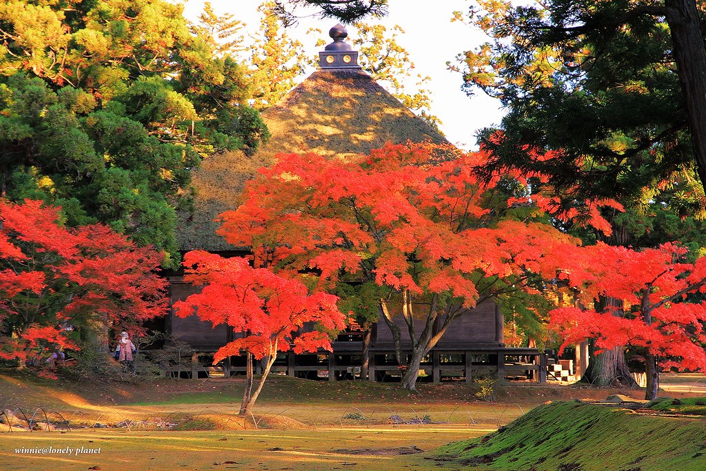 毛越寺是我四寺迴廊巡禮最後一站,它和中尊寺都是慈覺大師在西元850年開山,據傳當年慈覺在東北弘法,某天大霧瀰漫看不到路,忽見地上掉落點點白毛,於是順白毛前進,眼前赫然佇立一隻白鹿,慈覺走近,白鹿身姿消失在霧中,不久出現白髮老人說:「此地為靈地,應建立寺院廣為弘法」,於是慈覺建立嘉祥寺,就是毛越寺前身由來。