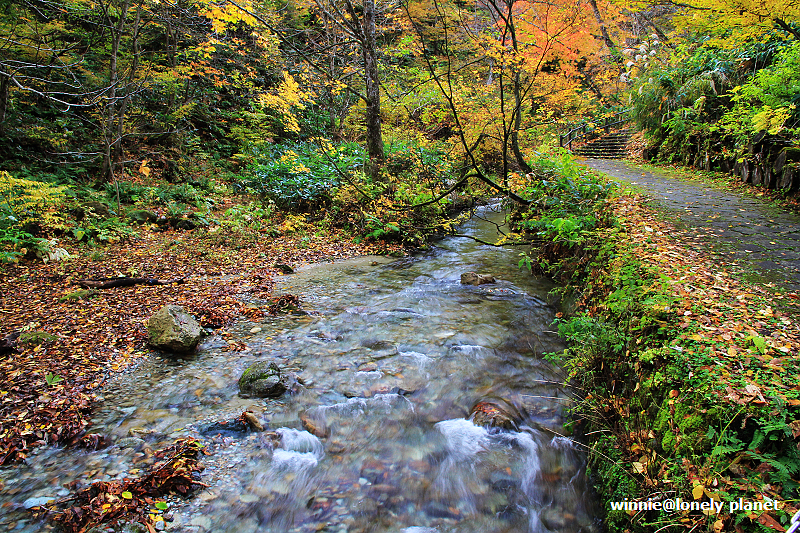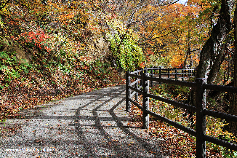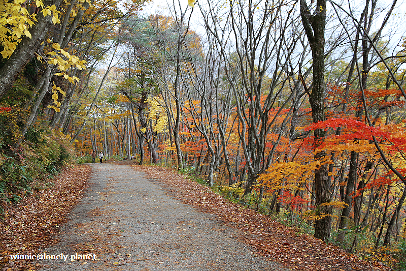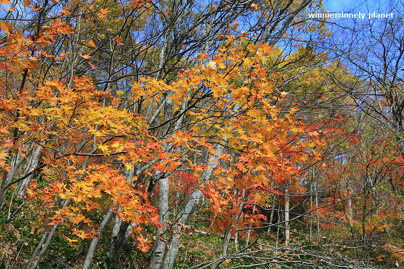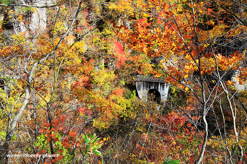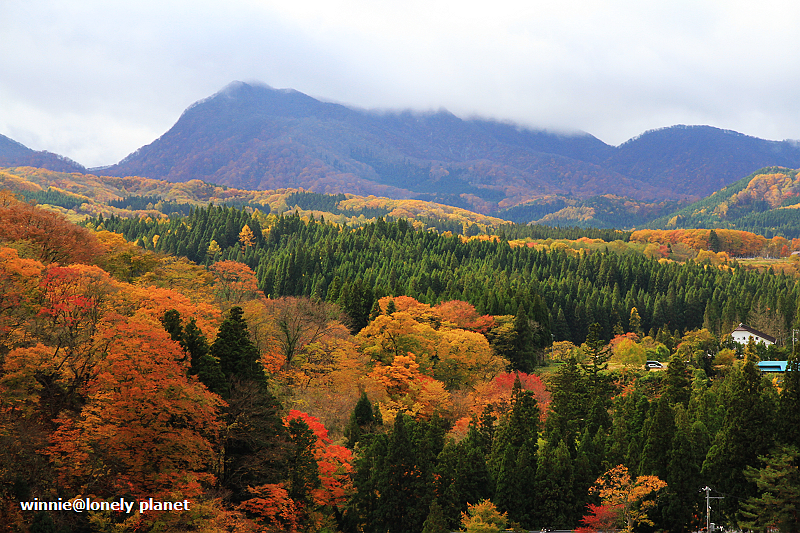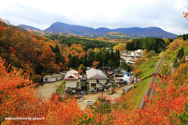 鳴子鄉第一天的「出羽街道中山越」功敗垂成,當晚以一千多年歷史的鳴子溫泉和旅館豐盛Buffet療癒身心後,老天爺或許是體恤我們遠道而來,第二天起床拉開窗簾一看,竟然出現藍天陽光,東北秋天氣候真是說變就變啊。深自慶幸在鳴子溫泉住一晚,讓我有機會目睹鳴子峽無法言喻的極美楓情,還首度體驗當鐵女拍火車的快感(追火車篇下回待續)。時隔半年多,腦海依舊時時浮現那滿山璀璨繽紛。