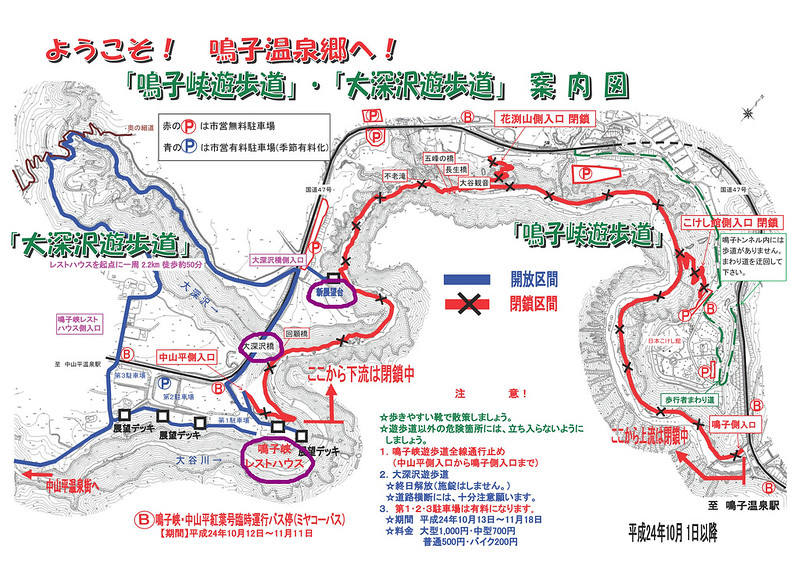 原本在峽谷底部沿著大谷川邊有一條2.5公里的「鳴子峽遊步道」,可惜2008年宮城縣地震導致步道崩壞而封閉一部分,2011年311大地震後更嚴重,乾脆全線封閉禁止通行。為了不影響觀光,官方趕在2008年10月紅葉狩熱季前開闢全新2.2公里「大深沢遊歩道」,2010年加上450公尺「中山平遊歩道」。我們在鳴子峽地區的行蹤可歸納為4大重點: