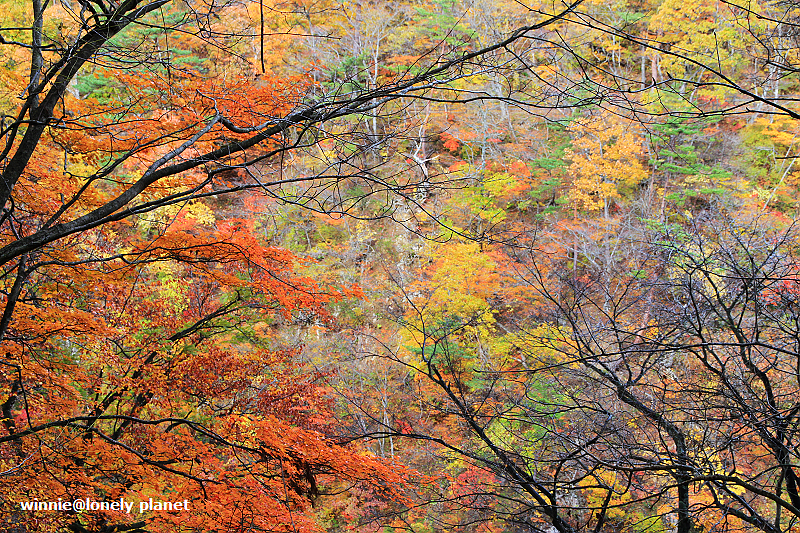 走到大深沢橋上俯瞰大谷川溪谷,深緋、銀朱、鬱金、琥珀、赤橙、淺蔥、青綠各色枝葉遍染斷崖峭壁與山澗溪谷,加上秋陽映照下反射的光影,將整座峽谷點綴得更加絢爛奪目。這樣壯闊清麗的山景,別有一種城市品嘗不到的況味。