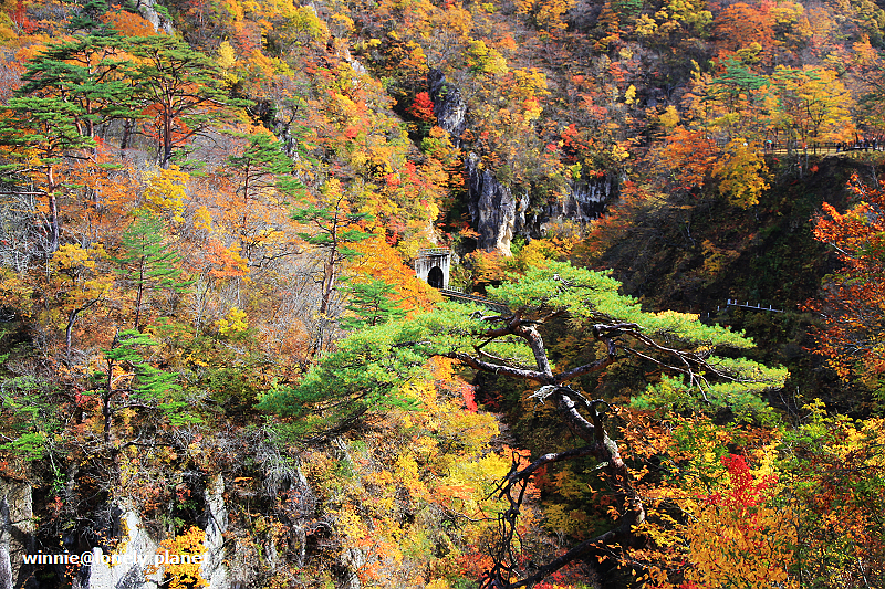 從鳴子溫泉車站搭「紅葉號」巴士在「鳴子峽鳴子口前」下車,走到「鳴子峡レストハウス」(Rest Houst)旁「見晴し台」,眼前立刻呈現一片色彩斑斕的世界,向前看,對面大深沢橋與花渕山被點綴得多采多姿;往下看,陸羽東線鐵路掩映五彩森林間。