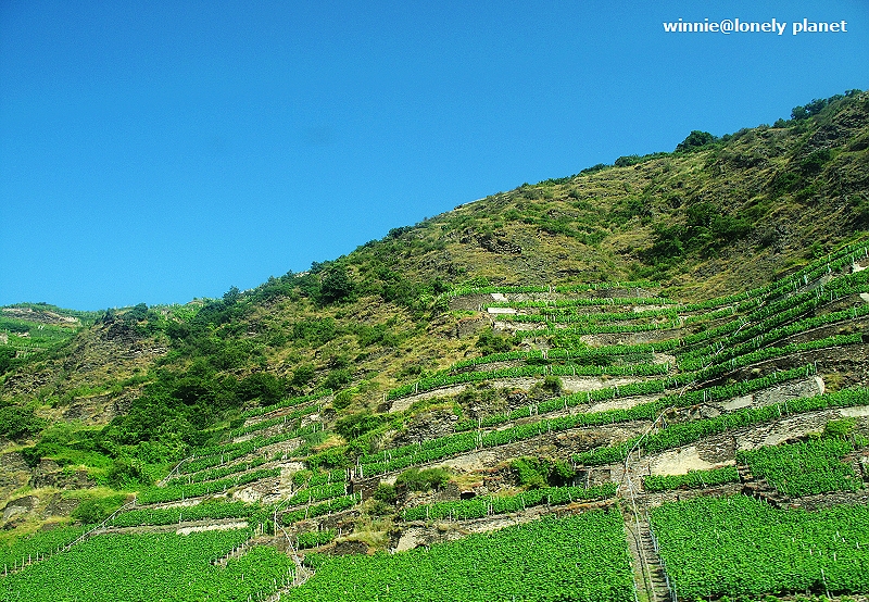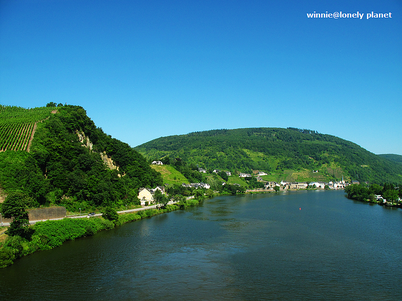 兩岸山丘綿延不絕的葡萄田,這一帶屬於著名摩塞爾-薩爾-烏沃(Mosel-Saar-Ruwer)葡萄酒產區