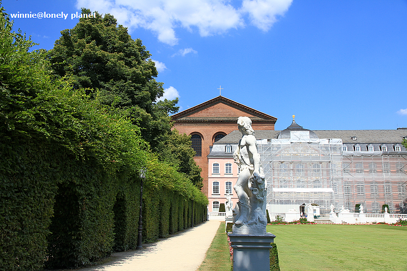 經過綠意盎然的美麗宮殿公園(Kurfürstliches Palais),後方磚紅色的是君士坦丁大帝加冕教堂(Konstantin-Basilika)