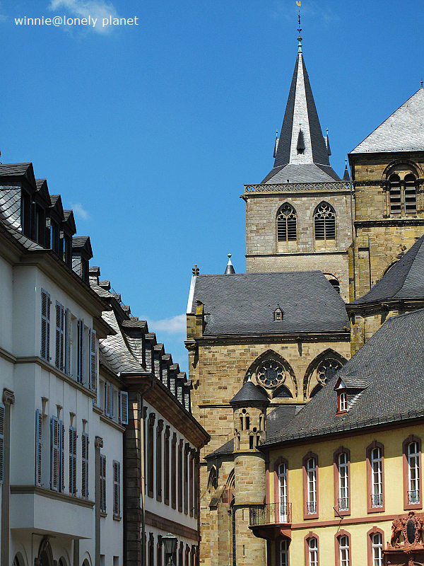經過中央市集廣場(Hauptmarkt)後左轉,迎面而來宏偉建築是特里爾大教堂(Trierer Dom)和聖母升天教堂(Liebfrauenkirche),先繼續往南走到凱撒浴場(Kaiserthermen),回頭再看這兩座教堂。
