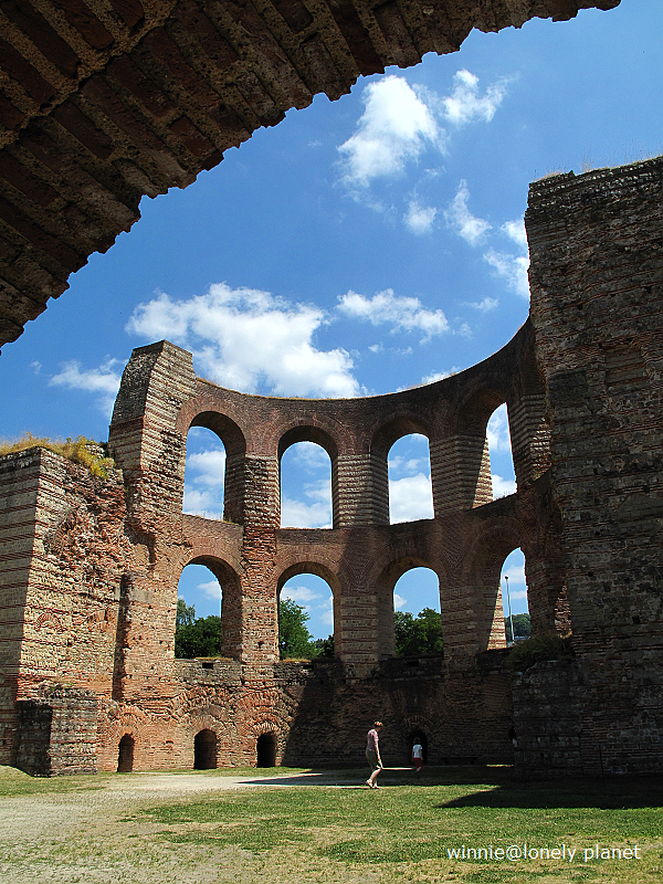浴場與古羅馬人日常生活息息相關,不只拿來洗澡,也是社交與休閒娛樂場所,只要有羅馬人統治的地方都會興建大大小小的公共浴場。特里爾曾經是羅馬帝國四帝共治制(Tetrarchy)西部首都,當然少不了浴場,規模最宏偉的有兩座:西元2世紀的芭芭拉浴場 (Barbarathermen)和西元4世紀的凱撒浴場(Kaiserthermen)。芭芭拉浴場比較遠,而且僅存一個大浴池可看,所以我們只去凱撒浴場,它是目前阿爾卑斯山以北保存最完整的古羅馬浴場。