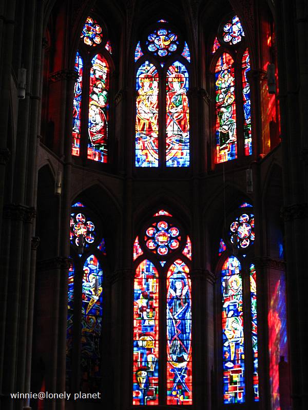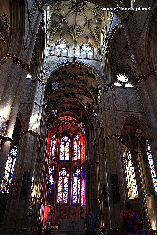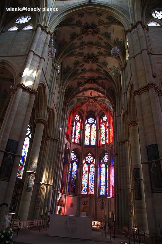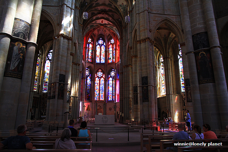 教堂主體為圓形建築,卻有希臘十字平面結構,每處凹角各有兩座如花瓣般展開的側聖堂,是相當罕見的教堂結構。環顧四周,圓柱撐起的哥德式穹頂和一扇扇美麗繽紛的彩繪玻璃窗使內部空間顯得崇高又深邃,散發出一股震攝人心的無形力量。人潮來來去去,大家都躡手躡腳不敢發出聲響,我們也坐下來,靜心感受這有如天國異境般莊嚴神秘的氛圍。