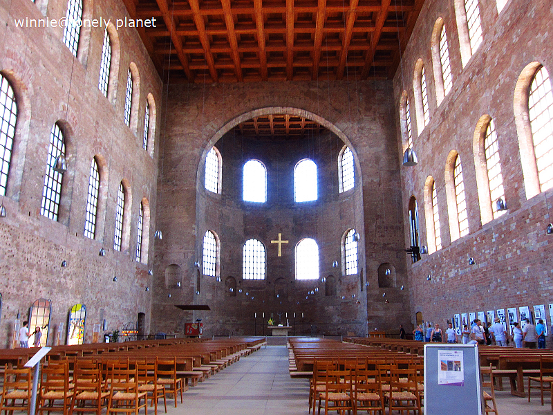 特里爾還有一座建於公元310年的君士坦丁大教堂,這座教堂本來是君士坦丁大帝擺放皇座的大殿,高33公尺、寬29公尺、長67公尺,是現存古羅馬時期單幢建築中最大的一座,挑高大殿沒有任何樑柱支撐,古羅馬人建築造詣著實令人嘆為觀止。中世紀兵荒馬亂時期,還曾經有小村莊在大殿裏,就知道當年驚人規模!君士坦丁大教堂後來成為大主教城堡,19世紀則變成新教教堂,直到今天。
