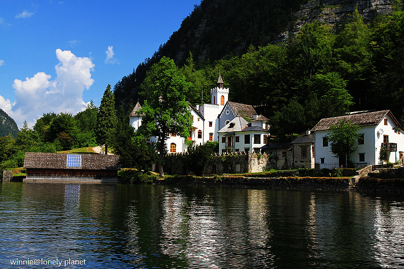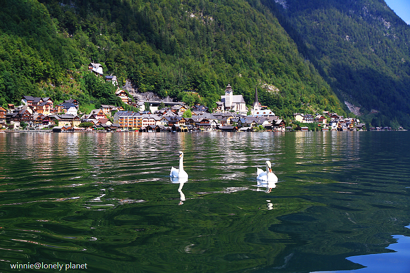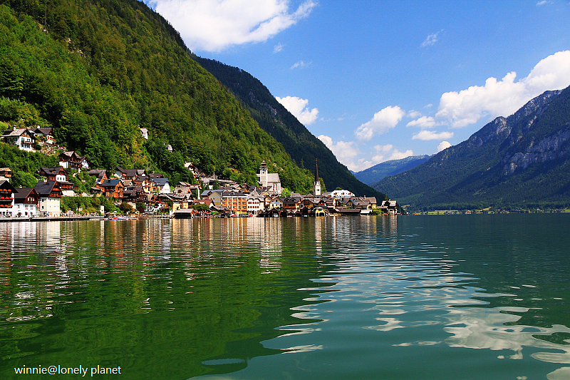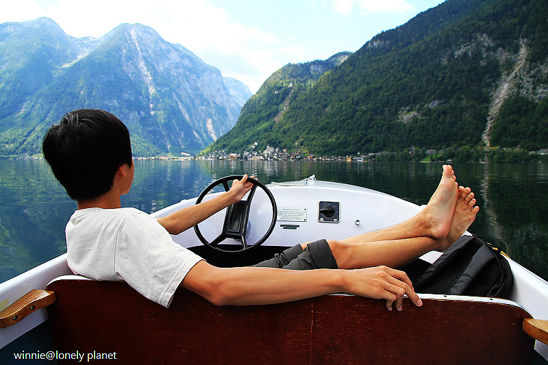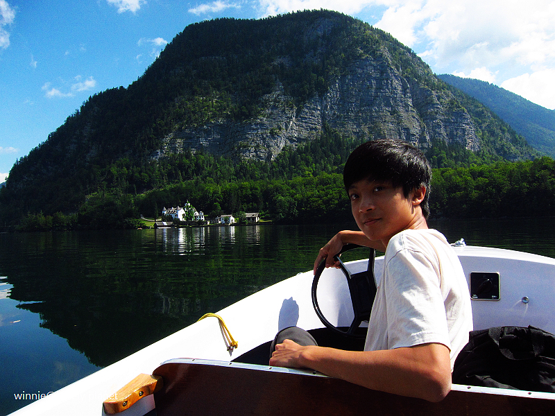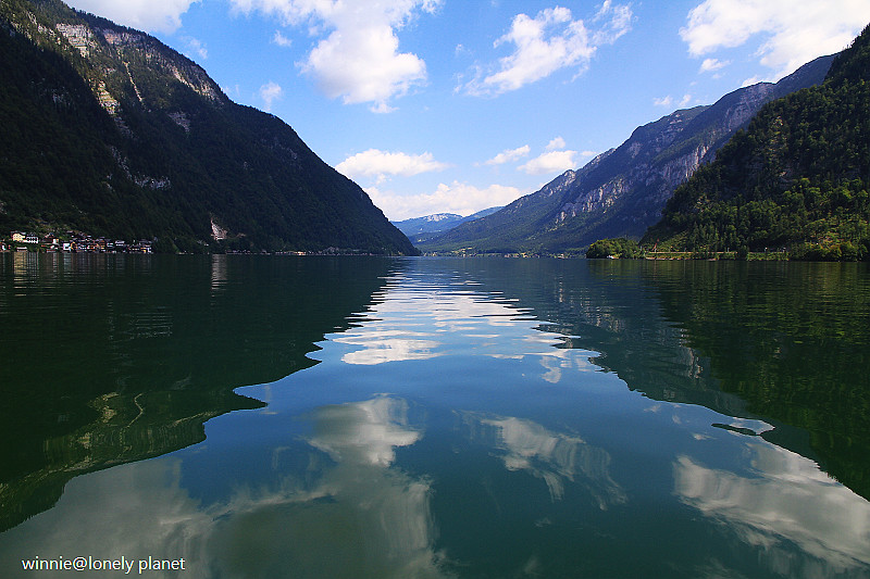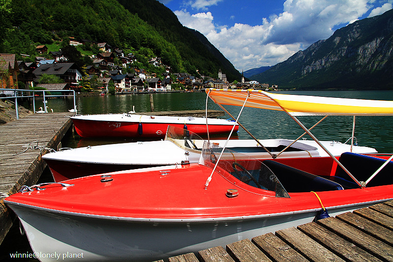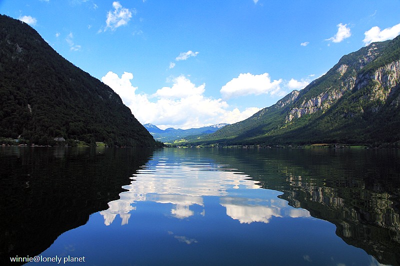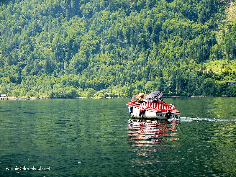 海拔3000多公尺高的壯麗山巒圍繞著Hallstatt湖,在藍天襯托下更加迷人。這種好天氣去鑽鹽洞太可惜了,我們決定租船遊湖,儘管非常炎熱,實景與倒影交疊成如夢似幻的一幅幅畫面卻成為我們最難忘的回憶。