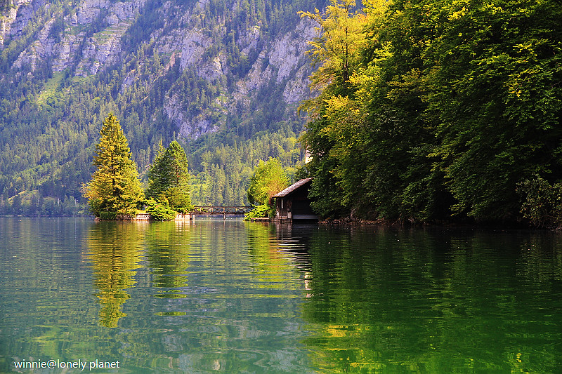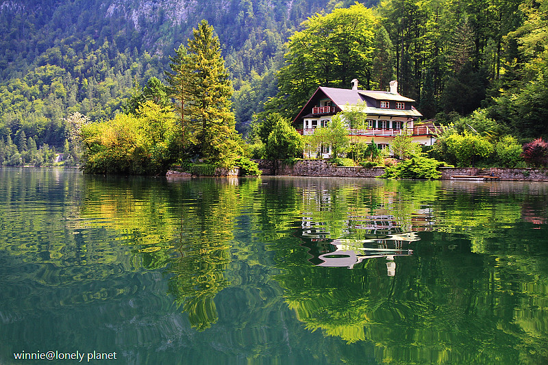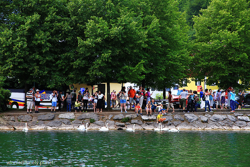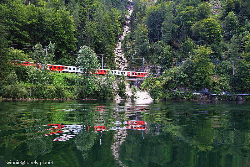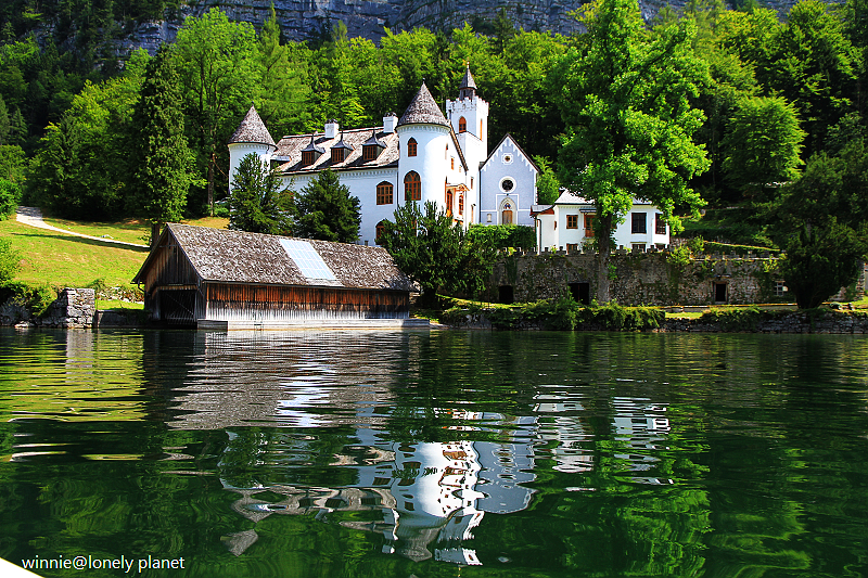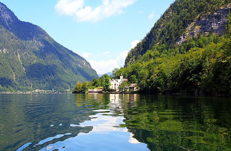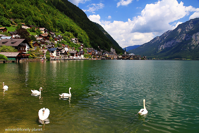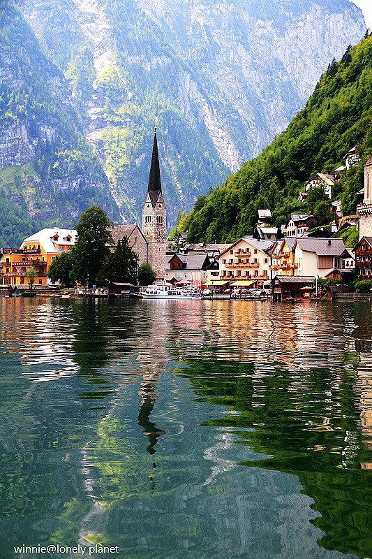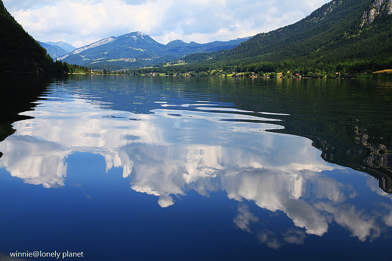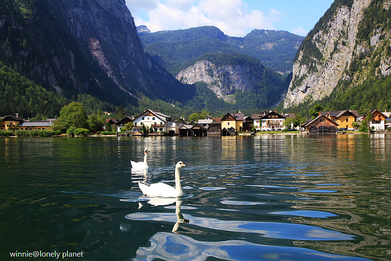 海拔3000多公尺高的壯麗山巒圍繞著Hallstatt湖,在藍天襯托下更加迷人。這種好天氣去鑽鹽洞太可惜了,我們決定租船遊湖,儘管非常炎熱,實景與倒影交疊成如夢似幻的一幅幅畫面卻成為我們最難忘的回憶。