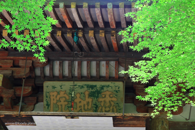 渡過太鼓橋右轉,沿著溪旁的巨杉下前行,會先看到仁王門,門前大石柱上刻著「女人高野大本山室生寺」