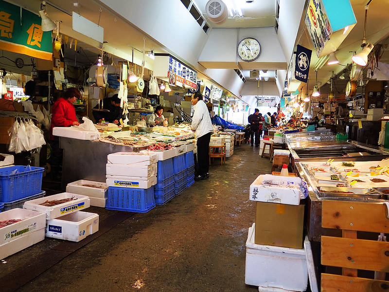 來青森當然不能錯過古川市場的のっけ丼,逛完三內丸山遺跡回到JR青森駅已經兩點多了,從車站正面歩行約10分鐘到中央古川通,就可以看到俗稱「古川市場」的「青森魚菜センター」紅底白字招牌。這裡從昭和40年代開始供應豐富當令食材,不但販售當天清晨從鄰近海域現撈的各式海產,還有惣菜、肉、漬物等,成為青森市民的廚房。