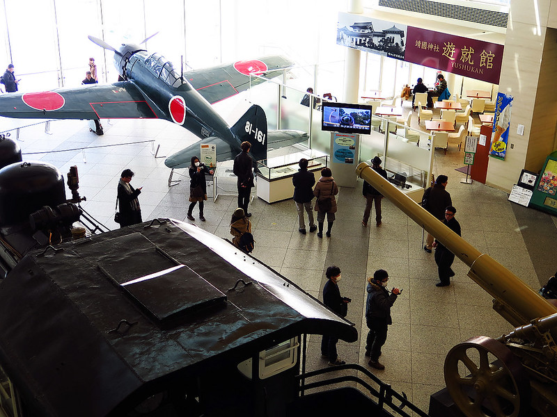 我們花了半個多小時逛神社內外苑,然後到隸屬神社的博物館「遊就館」。遊就館成立於1882年(明治15年),是日本第一座也是歷史最悠久的軍事博物館。剛開始只展示1882年幕末維新新政府軍陣亡者遺物,後來歷經日清戰爭與日露戰爭,1910年明治天皇下勅令將此館做為「蒐集、保存跟武器沿革相關之物件,作為軍事參考的場所」。「遊就館」這名字取得很有學問,源自《荀子。勸學篇》中「故君子居必擇鄉,遊必就士,所以防邪僻而近中正。」的「遊」「就」,原意是:居住要選擇合適的地方,交友要接近賢德之人,以免入歧途,而能做正確的事。主要在說明『環境對於為學的重要』
