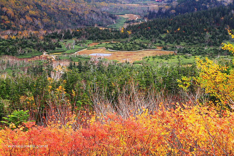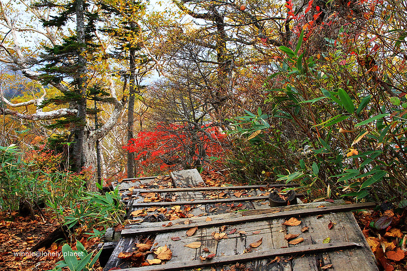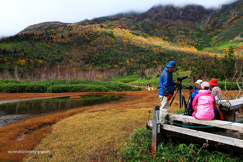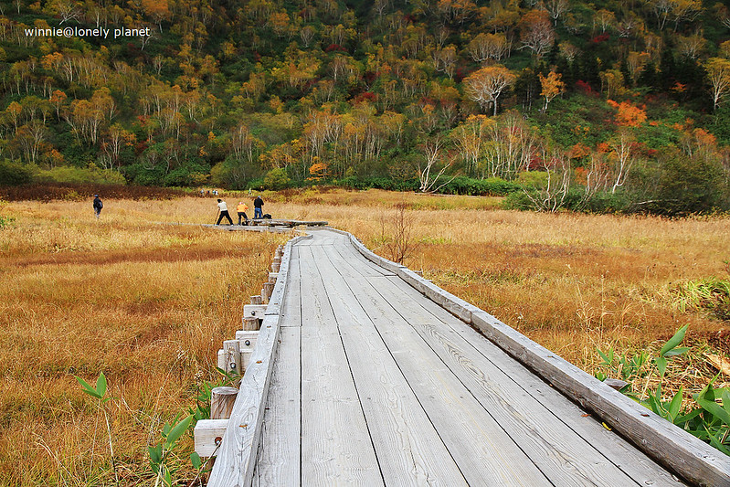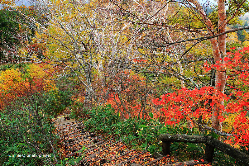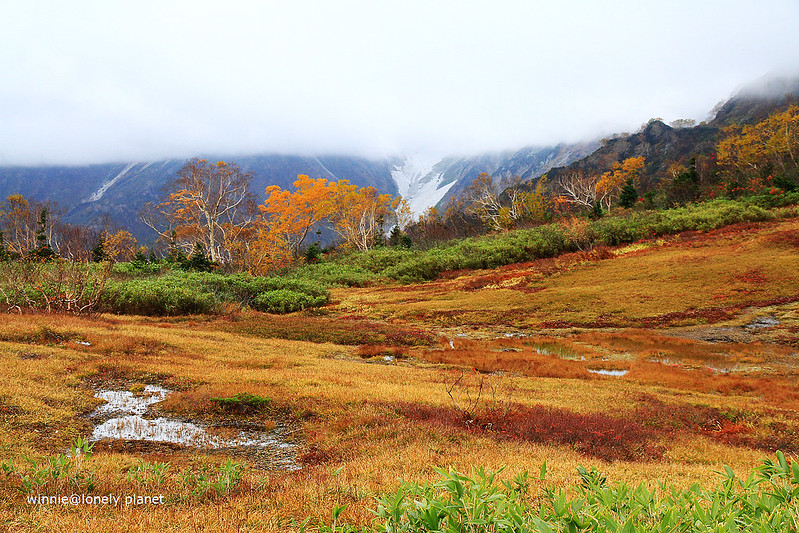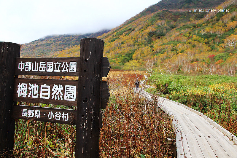 正如前面[2014秋信州放空之旅]所提,栂池自然園是遠赴白馬的兩大重點之一,為什麼會想來這處對多數台灣人陌生的景點?其實是有一次在旅遊雜誌上看到栂池自然園秋景,那片春花般紅艷的秋野彷彿一幅油畫,如實呈現「霜葉紅於二月花」之美,自此深植腦海,總是惦記著有一天一定要置身其中,這次總算成行,卻遇到颱風攪局。