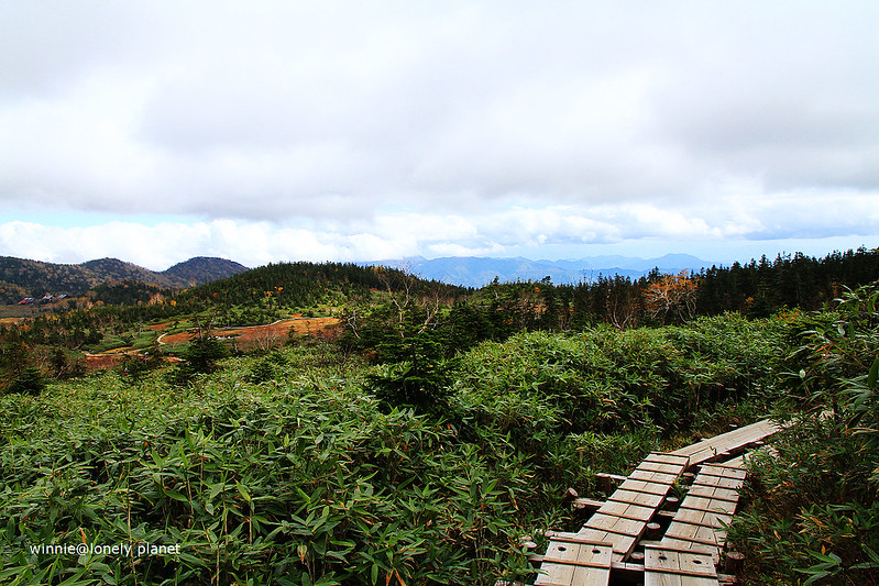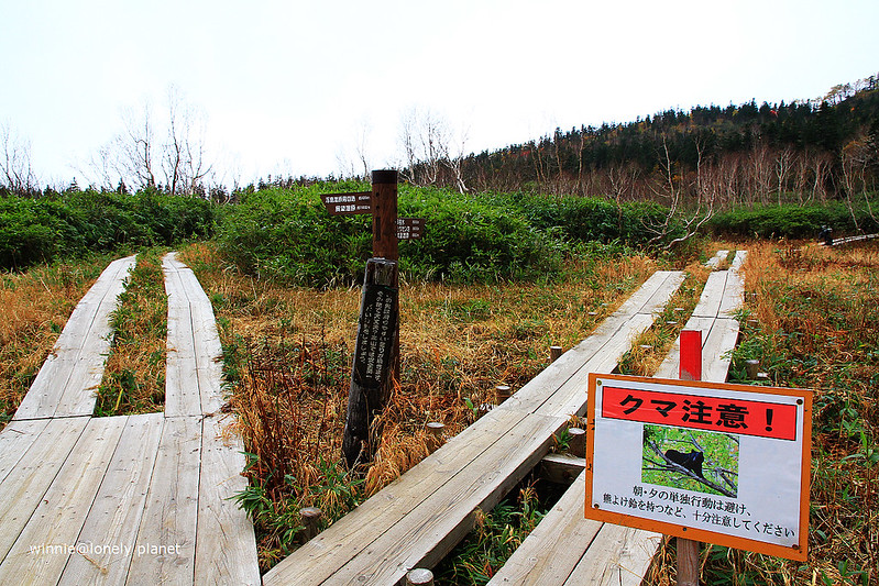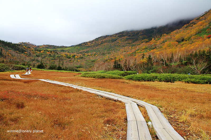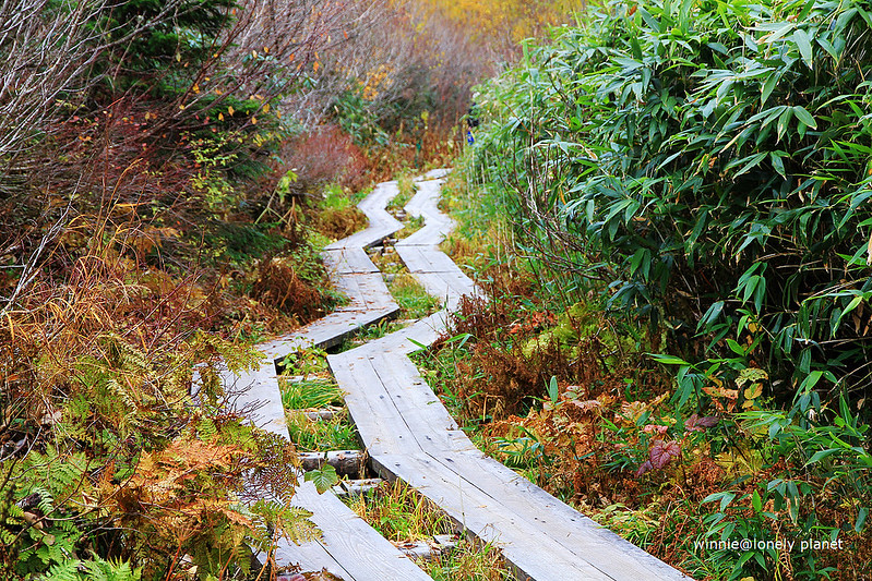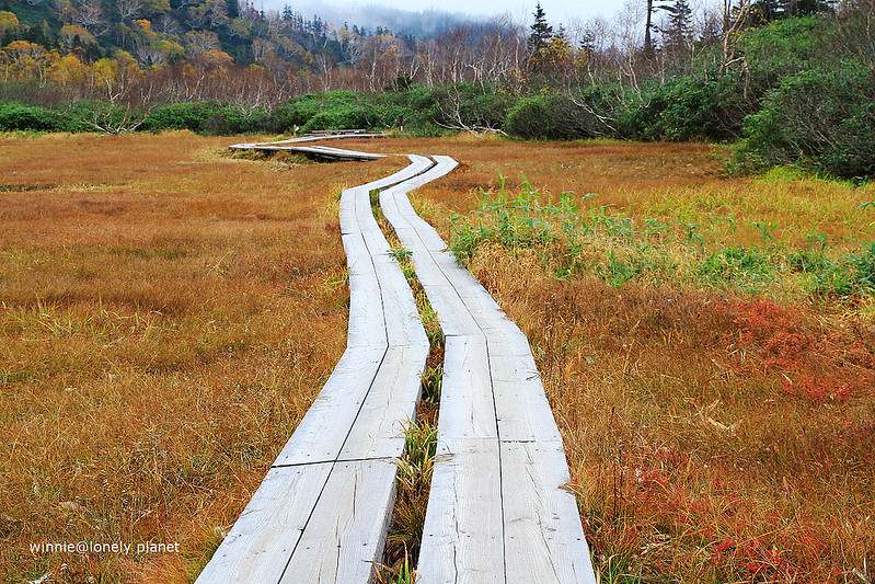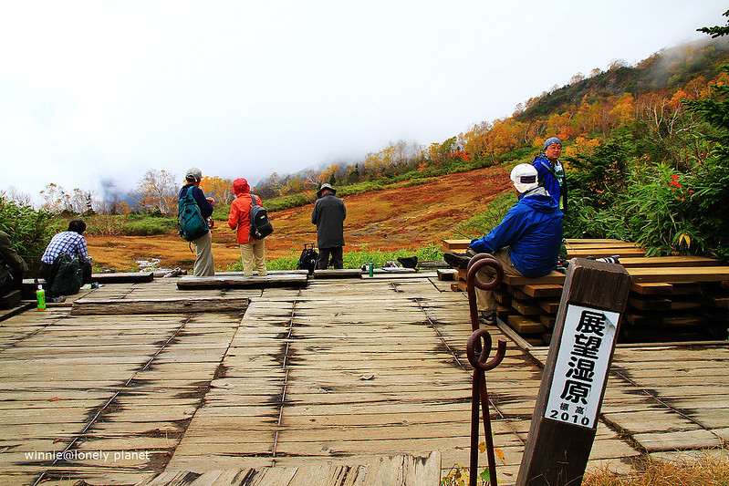 我大約11:30從遊客中心開始走,邊走邊拍慢慢逛,到最高點展望濕原才花了1.5小時。在展望濕原稍作休息並和其他遊客一樣祈禱雲開霧散,讓我看到白馬三山,可惜天候不佳,等了半個多小時總算看到一點點大雪溪,只好依依不捨踏上歸途。5.5公里步道雖然有一段上坡,走起來還算輕鬆,到浮島濕原叉路時,走右邊棧道上坡路較少較好走。