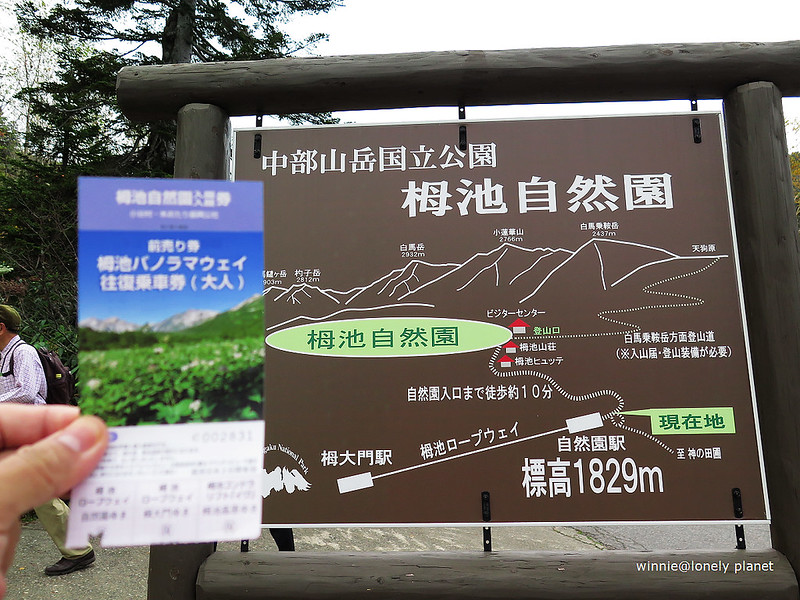抵達栂池高原駅,以淡季特價3220円(原價3,600円)買空中纜車來回券加入園門票的套票。纜車分兩段,第一段從標高839公尺栂池高原駅坐到標高1582公尺栂之森駅,這段以6人座小車箱運送,隨到隨搭,時間約20分鐘。到栂之森駅後走10分鐘到栂大門駅搭第2段纜車,這段是71人座大型纜車,平均20分鐘一班,5分鐘抵達標高1829公尺自然園駅。爬升途中,一路陽光普照風和日麗,正暗自高興,突然發現前方一大片烏雲緩緩逼近,範圍逐漸擴大,心想不妙!果然抵達自然園駅的時候,漫天烏雲已經先一步報到,想來是看不到白馬三山和大雪溪了。唉!既來之則安之,當作呼吸新鮮空氣練腳力吧!接著還要從自然園駅走400公尺才會抵達園區入口,開始栂池自然園健行。