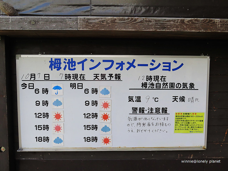 經過2天風雨肆虐,第4天終於放晴,吃完早餐連忙出發。本來行程規畫skala民宿載我到白馬駅,搭乘往栂池高原的巴士,雖然車程只有25分鐘,但是一小時才一班(時刻表),錯過就麻煩了。早上向民宿一家告別後,老闆大概可憐我的旅程被颱風攪局浪費一天,善心大發,決定先載我到白馬八方,將行李放在當晚下榻的「白馬源泉の宿まるいし」 ,然後直接前往栂池自然園起點:栂池高原站,省下很多力氣與時間,超感謝他的!不過老闆特別強調,淡季才有這種接送服務(原來冬天才是白馬旺季,淡季加颱風,這兩天只有我一名客人等於包棟哩≧∇≦)。