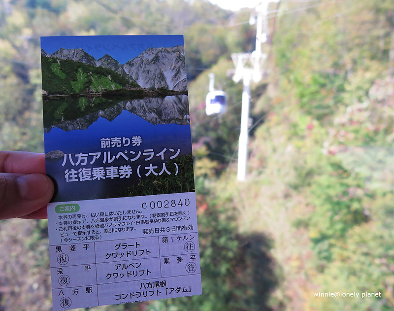 前一晚在白馬源泉の宿まるいし吃好睡好,一早起來是大晴天,從旅館望出去,遠方山頭白雪在陽光照耀下熠熠生輝,我心想:今天應該能看到白馬三山倒映八方池吧!從旅館大約走10分鐘來到八方纜車站(八方尾根ゴンドラリフト),買纜車套票(大人往復2,900円,特價2660円),接下來分三段搭乘全長3,445公尺的纜車。