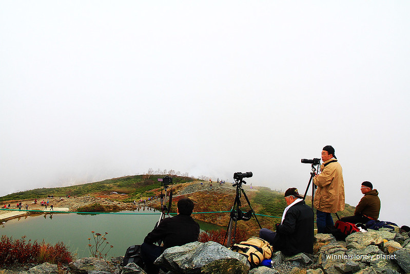 已經有一堆人架起大砲在高處守候,等待白馬三山倒映八方池的時刻