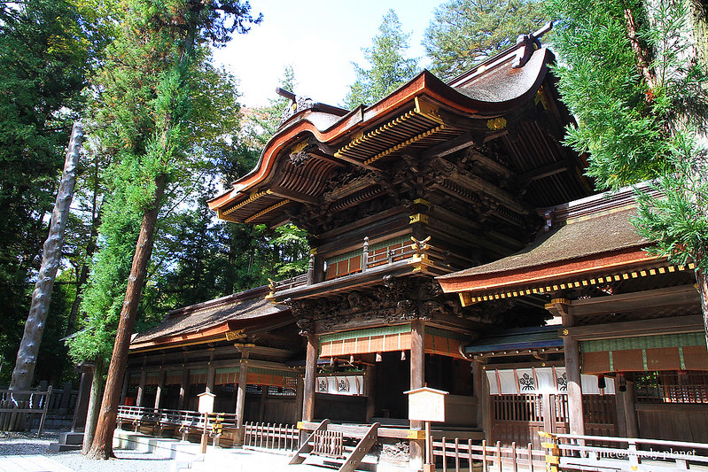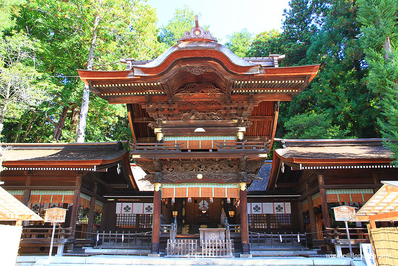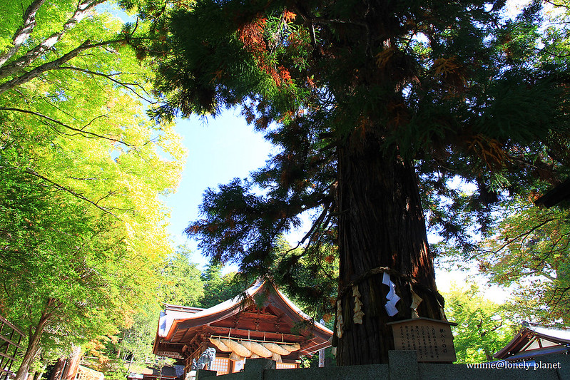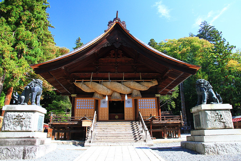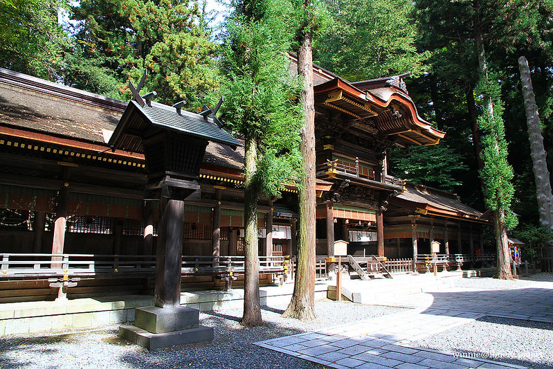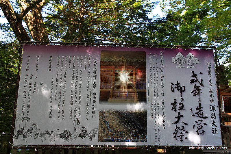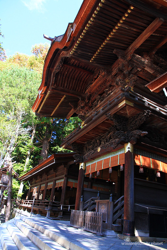 第一站來到旅館附近的下社秋宮,它就位於舊中山道和甲州街道交叉口,有好幾座建築被列為重要文化財。下社主神每年2月到7月在春宮,8月到隔年1月在秋宮,各住半年。8月1日會舉行遷座儀式,除了將主神從春宮請到秋宮來,也是感謝豐收的祭典。