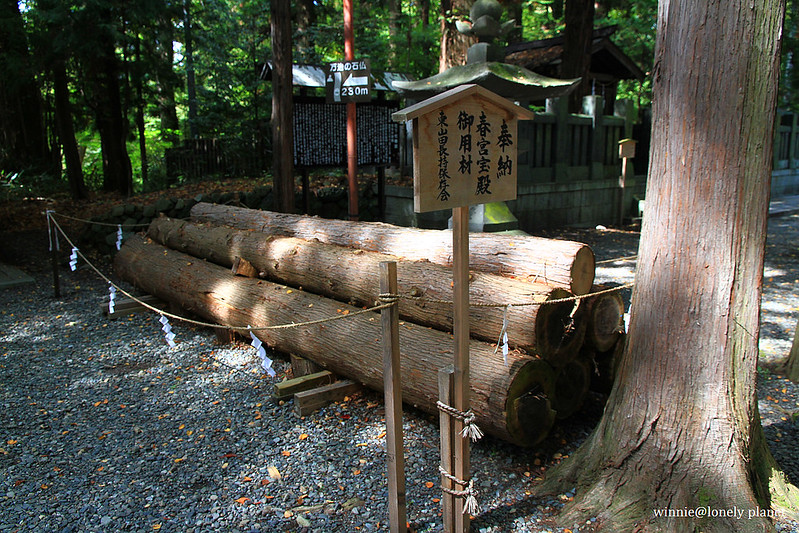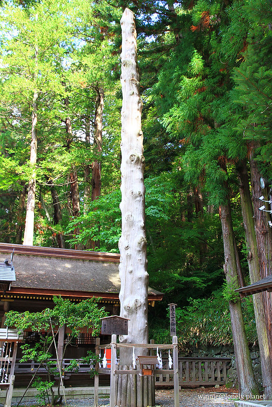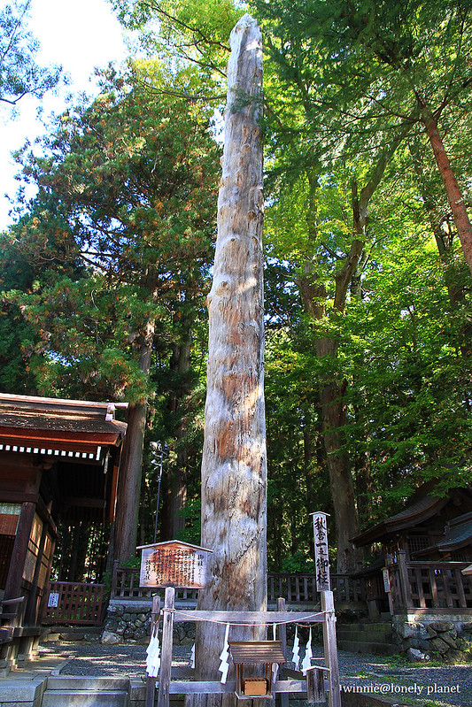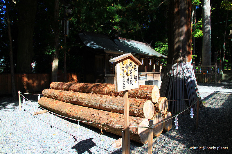 目前秋宮境內矗立2004年御柱祭用過的4根御柱,這些御柱要在御柱祭三年前就開始選材準備,