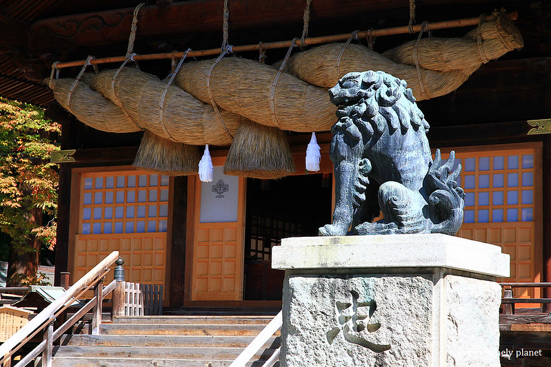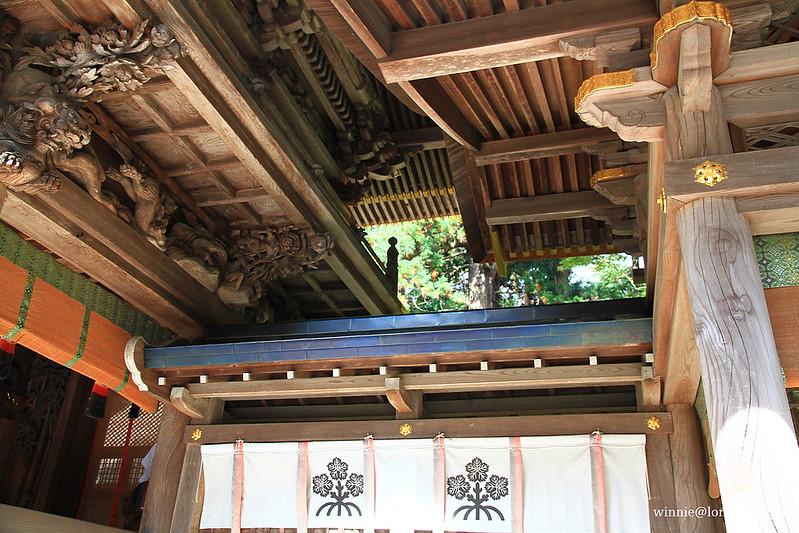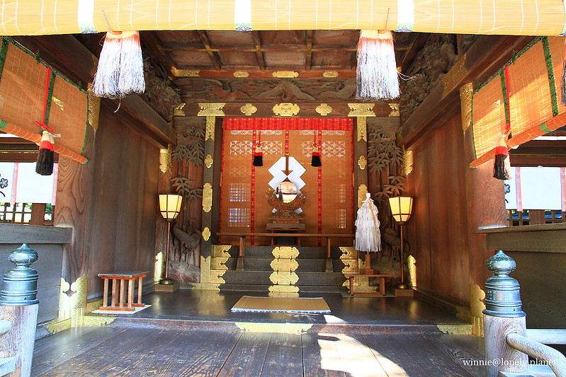再往前走是1835年建造的重要文化財「神樂殿」,兩側的狛犬高1.7公尺,據說是日本第一大青銅製品